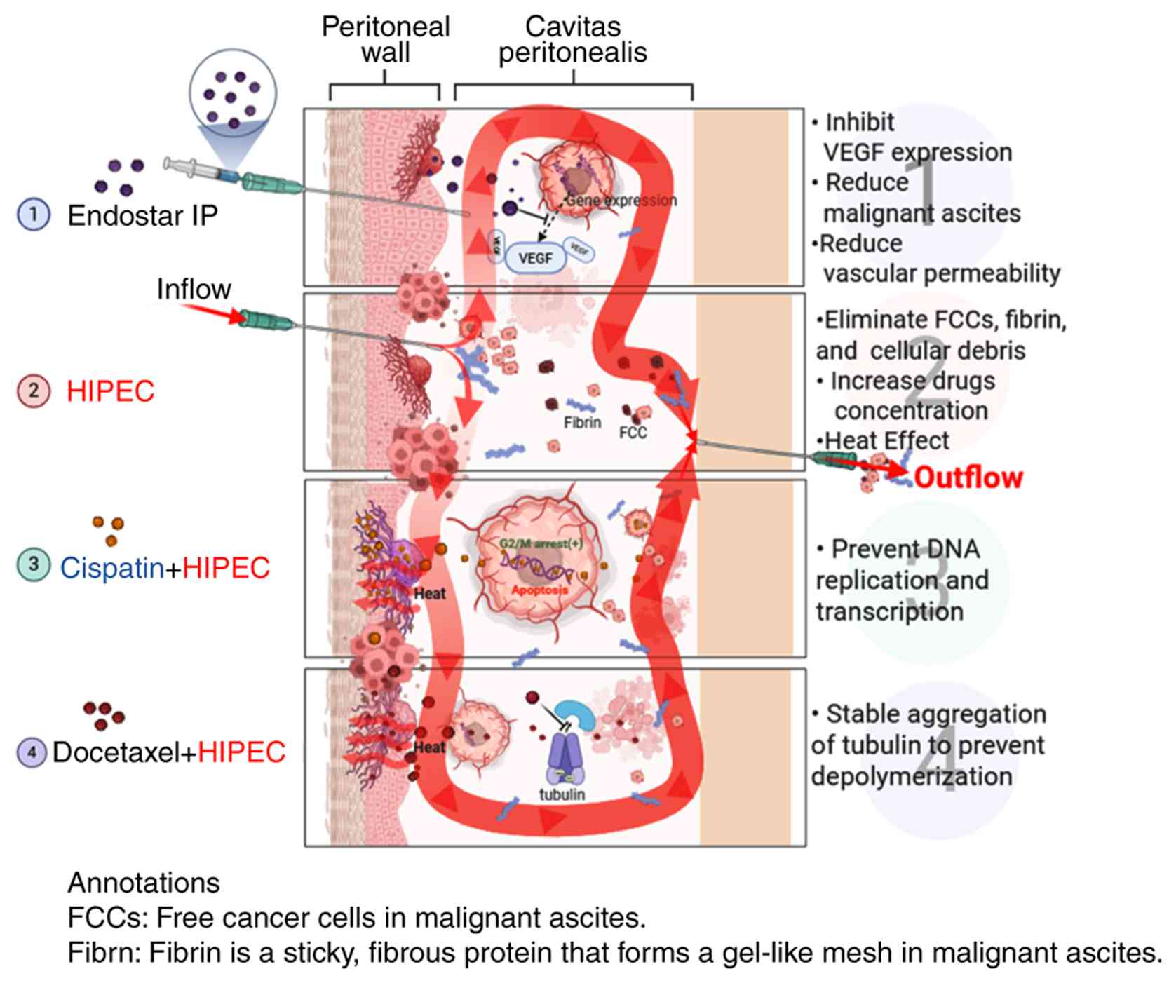 As shown in Fig. 4, the general mechanism of Endostar combined with docetaxel/cisplatin HIPEC in the treatment of MA may be as follows: i) Endostar inhibits vascular endothelium proliferation, differentiation and migration, reducing blood vessel filtration area and permeability, reducing material exudation and controlling MA osmotic pressure, thereby reducing effusion (7,35,36). ii) HIPEC treatment kills MA tumor cells by repeated washing, causing anoikis and tumor cell detachment. Heat changes the tumor cell membrane and vascular permeability, reducing drug metabolism and increasing drug concentration (37,38). Heat shock protein activation by heat can induce an autoimmune attack on tumor cells, block angiogenesis and cause protein denaturation (39). iii) Cisplatin can directly enter the tumor cell nucleus to prevent DNA replication and transcription to achieve the purpose of killing tumor cells (40). iv) Docetaxel binds to tubulin subunits after entering the body, stably accumulates tubulin, prevents depolymerization and inhibits tumor cell proliferation (41).