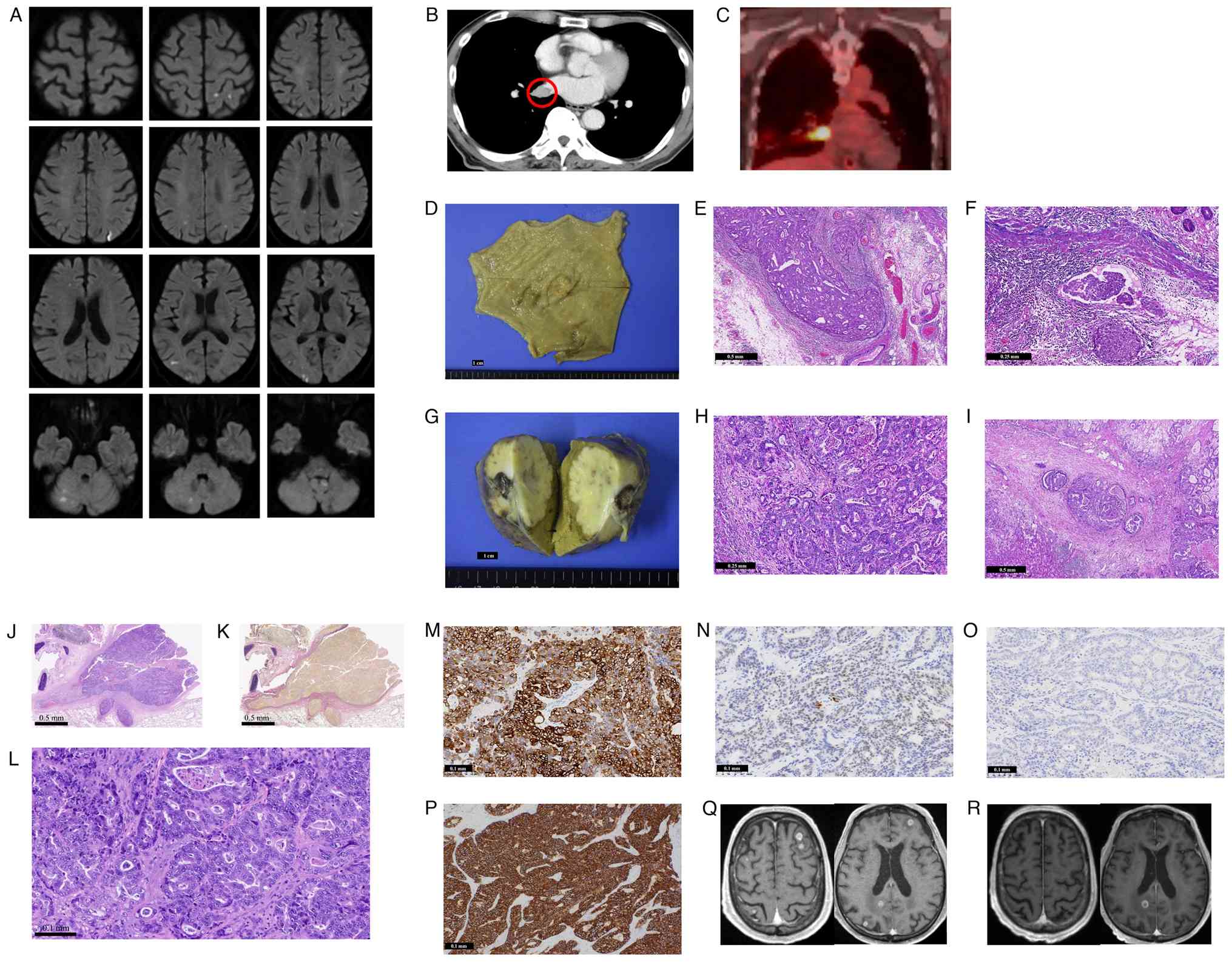 The resected specimen measured 16×12×7 cm. The pulmonary vein was dilated to 2.0 cm and filled with a grayish-white mass, which had similar histologic features as the previously resected gastric and hepatic tumors (Fig. 1D-L). Immunohistochemical staining was positive for CK7, partially positive for CDX2, and negative for CK20, confirming the diagnosis of pulmonary vein metastasis from gastric adenocarcinoma. Additionally, HER2 immunohistochemistry was strongly positive (IHC 3+) (Fig. 1M-P). Because the surgical margins of the pulmonary vein were positive, chemotherapy with S-1, oxaliplatin, and trastuzumab was subsequently initiated in March 2024. In August 2024, the patient developed new brain metastases, which were treated with additional stereotactic radiotherapy (SRT/SRS). In October 2024, the brain metastases further progressed, prompting a switch in the chemotherapy regimen to trastuzumab deruxtecan for its potential efficacy against brain metastases, resulting in partial regression of the brain lesions (Fig. 1Q and R). In June 2025, however, chemotherapy was discontinued due to a decline in the patient's performance status. As of July 2025, the patient remains alive under best supportive care.