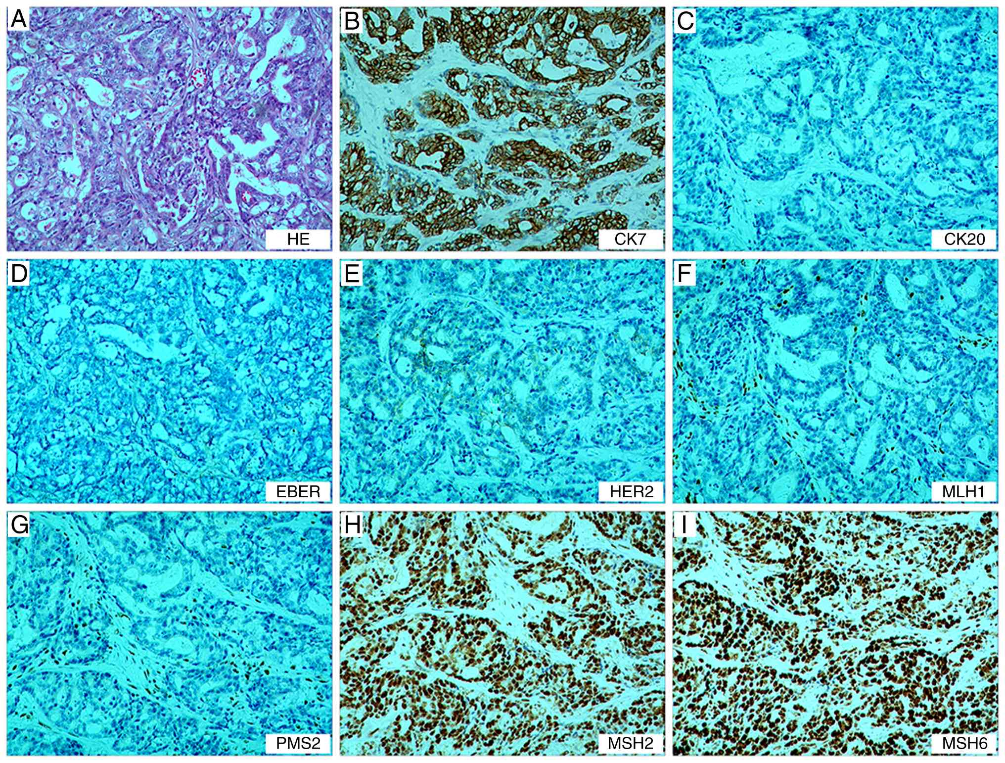 The patient, a 74-year-old man presented to the Southern University of Science and Technology Hospital (Shenzhen, China) in April 2022 with complaints of epigastric discomfort and anorexia for 2 months. CT revealed diffuse gastric wall lesions accompanied by multiple enlarged lymph nodes around the stomach, suggesting the possibility of infiltrative gastric cancer (data not shown). In April 2022, gastroscopy identified a large ulcer near the pylorus that bled easily upon palpation. Biopsy confirmed a diagnosis of poorly differentiated adenocarcinoma. In May 2022, following further examinations including contrast-enhanced thoracoabdominal computed tomography gastroscopy with biopsy, the patient underwent a radical gastrectomy. Post-surgical pathology analysis revealed a moderately-to-poorly differentiated gastric adenocarcinoma, categorized as diffuse type according to Lauren's classification (17). Cancer emboli were observed in blood vessels, and nerve involvement was also noted. Both surgical margins were negative for cancer; however, lymph node metastasis was found in the surrounding adipose tissue (3/16). Metastases were observed in the 8th lymph node group (1/1), and the 1st and 3rd groups (3/5), while no metastases were observed in the 9th group (0/3). The immunohistochemistry results in accordance with standard clinical diagnostic protocols were as follows: MutL homolog 1 (−, deletion), postmeiotic segregation increased (S. Cerevisiae) 2 (−, deletion), MutS homolog (MSH)2 (+, no deletion), MSH6 (+, no deletion), CK7 (+), CK20 (−), C-erb-2 (0, negative) and EBER in situ hybridization (−), (Fig. 1; data for CK and Ki-67 are not shown)