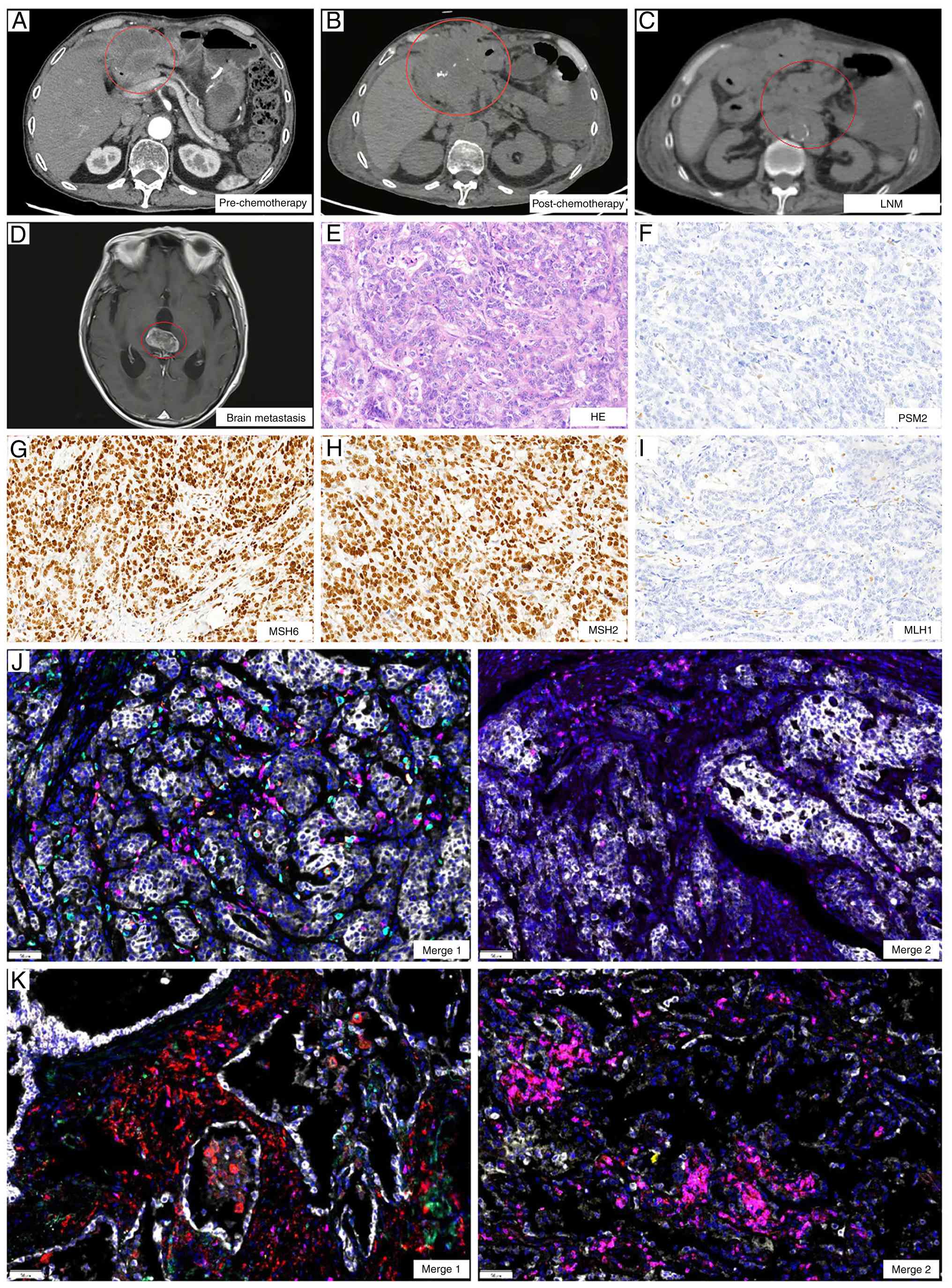 The abdominal metastases were located near the abdominal wall, and following patient consent, a biopsy of the lesions was performed to further characterize them. The biopsy results confirmed metastatic adenocarcinoma and dMMR status, consistent with baseline findings (Fig. 2E-I). To assess the potential underlying factors, both the postoperative pathological specimen and the post-treatment biopsy specimen underwent TIME-PRO assay.