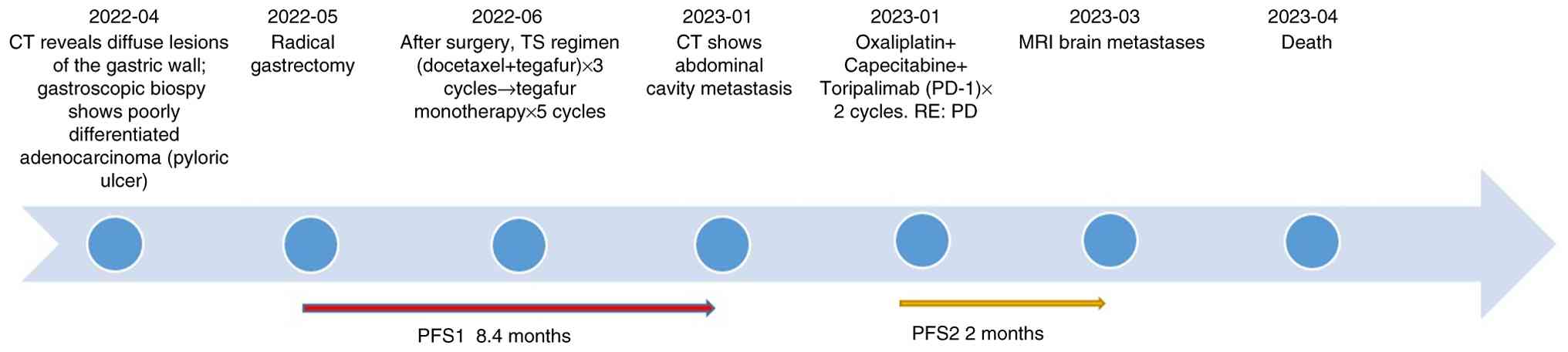The present case was sourced from the Department of Oncology at Southern University of Science and Technology Hospital (Shenzhen, China). The initial consultation date of the patient was in April 2022. The present study was approved by the Ethics Committee of Southern University of Science and Technology Hospital [approval no. 2023(12)], and the patient signed an informed consent form, agreeing that case information and test results from pre- and post-treatment specimens may be used for academic reporting. The standard treatment protocol strictly adhered to the 2021 Chinese Clinical Oncology Society Guidelines for the Diagnosis and Treatment of Gastric Cancer (12).