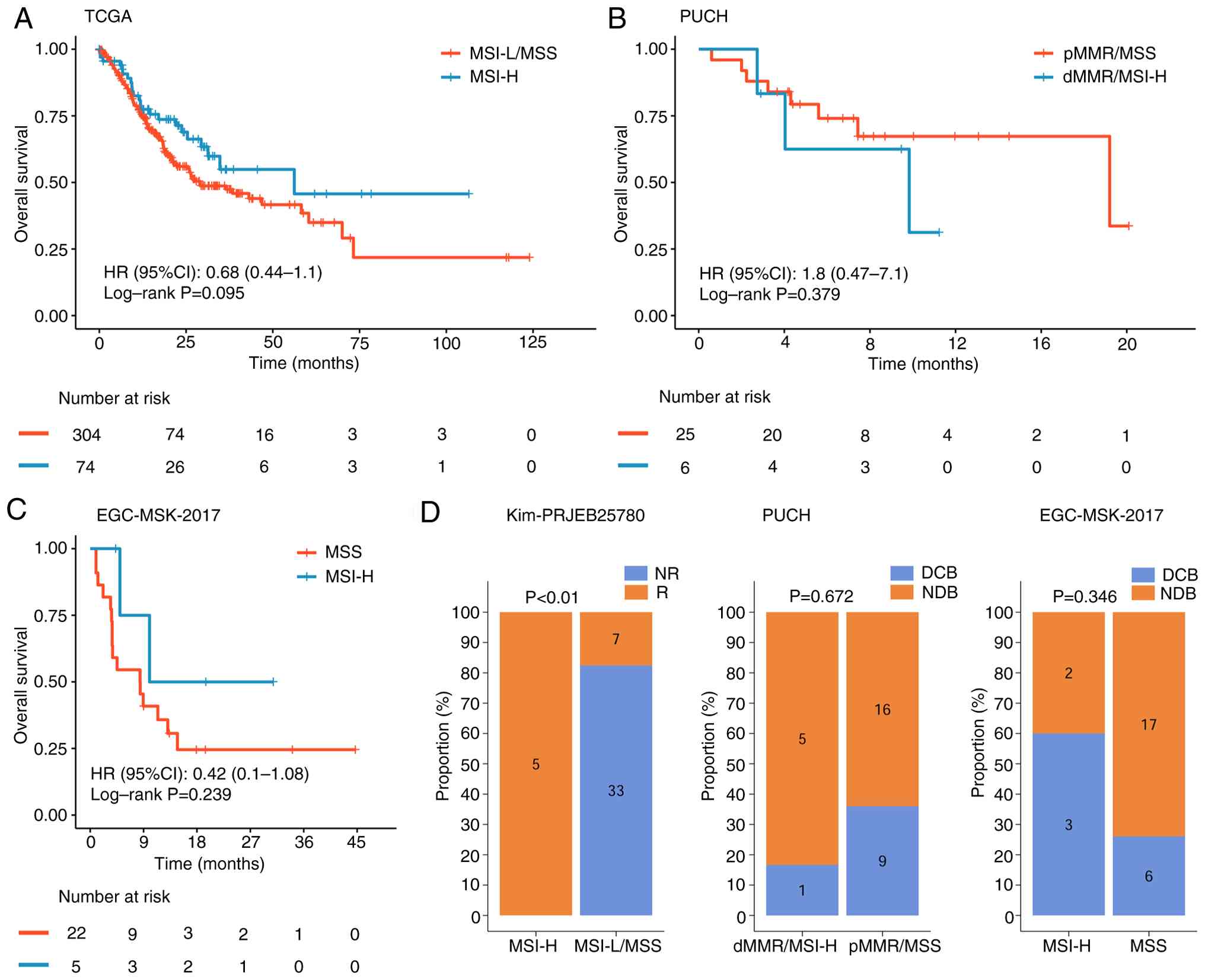 Analysis of the Kim cohort demonstrated a significant difference in immunotherapy response between the MSI-H and MSS cohorts. By contrast, no significant difference was observed in the PUCH cohort between the dMMR/MSI-H and pMMR/MSS groups. In the EGC-MSK-2017 cohort, the MSI-H group exhibited a markedly higher durable clinical benefit rate, but this difference was not statistically significant compared with the MSS group (Fig. 5D).