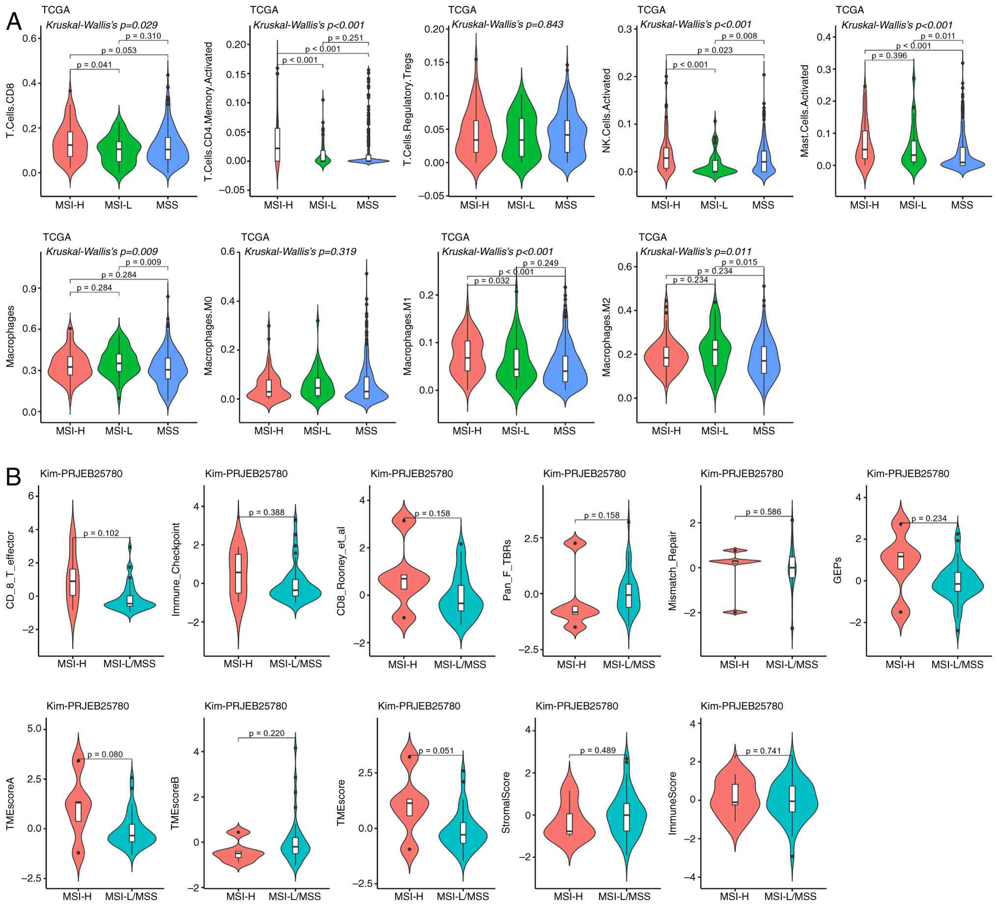 TCGA cohort revealed that, compared with the MSS population, patients with MSI-H had a significantly higher proportion of CD4+ T cells, natural killer (NK) cells, mast cells and M1 macrophages. For CD8+ T cells, a significant difference was only observed between MSI-H and MSI-L groups, with no difference detected between MSI-H and MSS groups (Fig. 6A). In the Kim cohort, no significant differences between MSI-H and MSS/LMSS groups were demonstrated for any of the detected immune-related indicators (Fig. 6B).