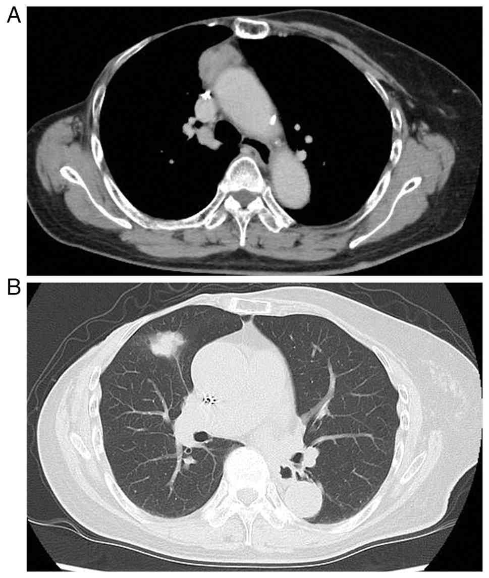 Contrast-enhanced chest computed tomography (CT) revealed a pulmonary nodule (26 mm in size) in the right middle lobe adjacent to the interlobar pleura without mediastinal lymph node enlargement, and a solid tumor (30 mm in size) in the right anterior mediastinum (Fig. 1). Positron emission tomography (PET) revealed an accumulation of fluorodeoxyglucose [standardized uptake value (SUV) max, 4.3 and 4.5] but no accumulation elsewhere (data not shown). Blood test results were normal, including those of tumor markers [carcinoembryonic antigen (CEA), squamous cell carcinoma (SCC) associated antigen and cytokeratin 19 fragment]. The SUVmax value of the mediastinal lesion was low for malignant lymphoma or TC, which typically show SUVmax value exceeding 5.0–10.0 (14,15). By contrast, the mediastinal lesion in this case demonstrated a lower SUVmax of 4.5. Therefore, it was considered a thymoma. The pulmonary lesion was diagnosed as either lung cancer [C-T2a(pl1) N0M0] based on the TNM classification system (8th edition) (16) or pulmonary metastasis from breast cancer.