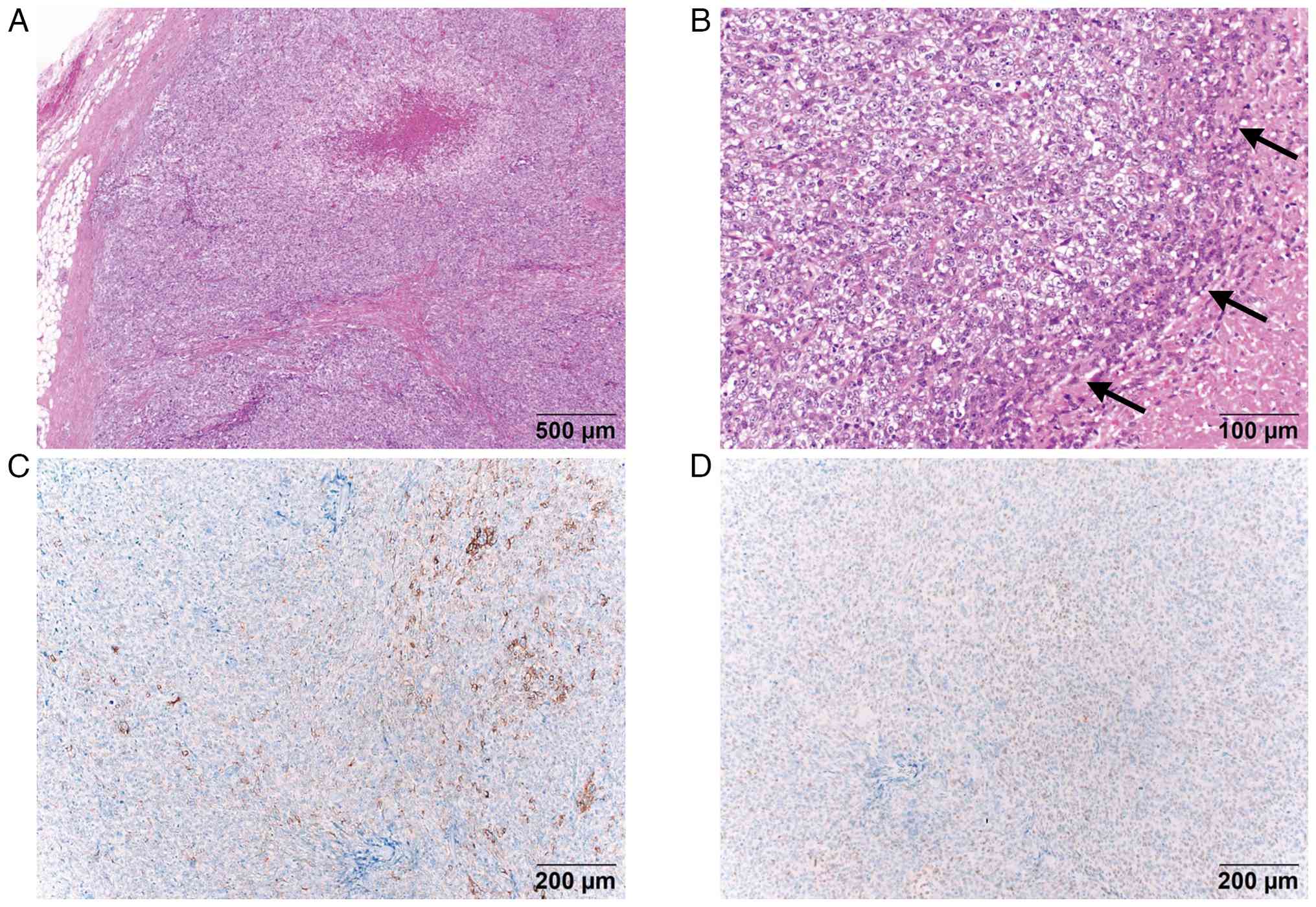 CT-guided biopsy was not performed prior to surgery, as the lesions were considered resectable. This procedure often yields limited tissue samples, which may compromise accurate histopathological diagnosis, particularly in thymic epithelial tumor. Moreover, it was avoided due to the potential risk of tumor seeding along the puncture tract. In addition, the anatomical location of lesions raised concern for air embolism associated with transthoracic needle insertion. Therefore, upfront surgical resection was selected: Middle lobectomy with systemic lymph node dissection and radical thymectomy with partial pericardium were performed via videoscopic surgery. Intraoperative pathology revealed both tumors to be poorly differentiated carcinomas. The sample was embedded in a cryoprotective compound and frozen at −10 to −15°C. Sections were cut at 5-µm thickness using a cryotome and subsequently stained by the rapid hematoxylin and eosin (H&E) technique for ~3 min at room temperature. The slides were microscopically evaluated by two pathologists using a light microscope (BX53; Olympus Corporation). However, determining the primary tumor was difficult. Macroscopically, a whitish solid tumor (25×20×30 mm in size) was observed in the resected anterior mediastinal resected specimen. Histologically (Fig. 2A and B), the tumor was surrounded by a fibrous capsule, but focal fatty invasion and necrosis were observed. The tumor was composed of epithelioid cells with marked pleomorphism and frequent mitosis. Furthermore, the tumor contained thymoma components equivalent to type B2-3 accompanied by lymphocytic infiltration. These finding indicated poorly differentiated and highly malignant thymic-origin tumor. All specimens were fixed with 10% neutral buffered formalin for 24–48 h at room temperature, embedded in paraffin and cut into 4-µm thick sections. Immunohistochemistry was performed using the BenchMark Autostainer (Roche Diagnostics) according to the manufacturer's recommended protocol. Antigen retrieval was performed with PROTEASE1 for 4 min or with ULTRA Cell Conditioning Solution (ULTRA CC1) at 100°C for 64 min. The BenchMark Autostainer automatically performed all subsequent processes, including deparaffinization in xylene and rehydration in ethanol. Sections were then immersed in 0.01 mol/l citric acid buffered solution, followed by blocking using the UV DAB inhibitor and protein blocking reagent included in the UltraView Universal DAB Detection Kit (Roche Diagnostics), which was applied at room temperature according to the manufacturer's protocol. Endogenous peroxidase activity was quenched automatically on the BenchMark Autostainer using the hydrogen peroxide-based inhibitor included in the same detection kit.