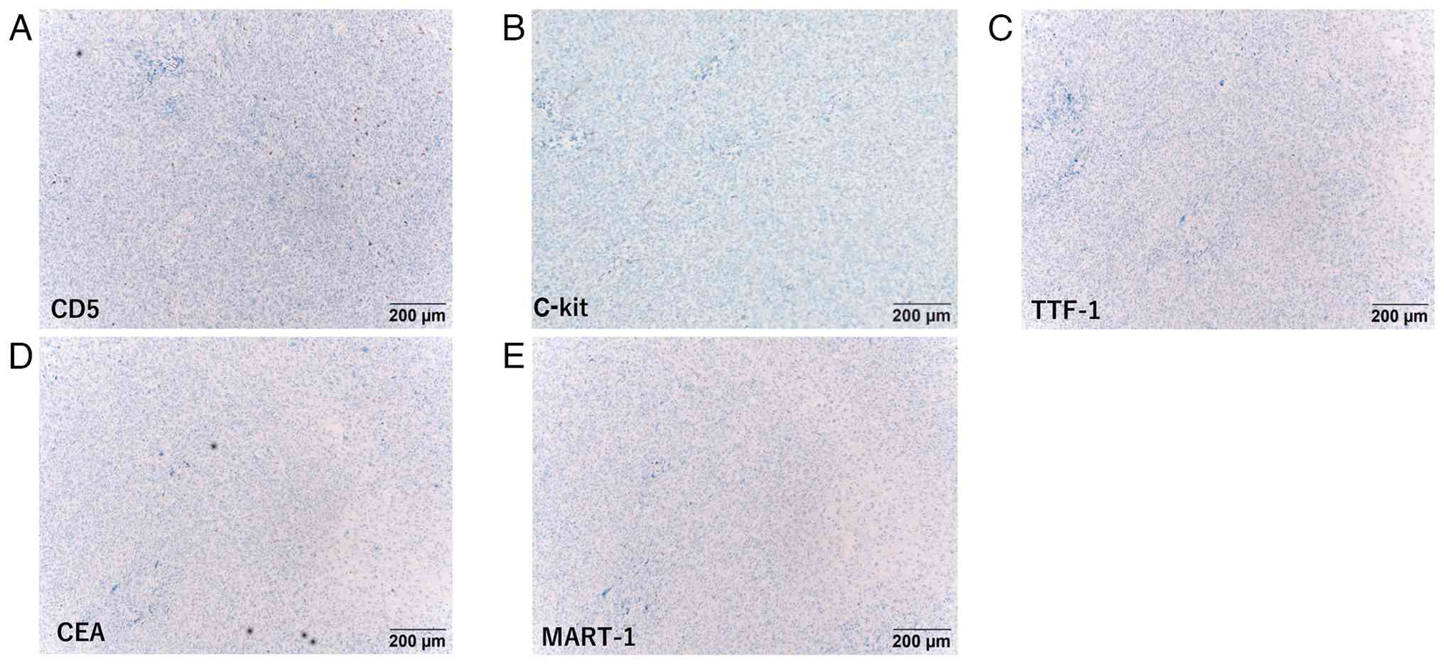 Microscopic evaluation was performed with a BX53 optical light microscope (Olympus Corporation), and two pathologists independently assessed the staining results. Immunostaining revealed partial positivity for keratin AE1/3 and P-63 (Fig. 2C and D), but negativity for C-kit and CD5 (Fig. 3A and B), suggesting a poorly differentiated thymic SCC or undifferentiated carcinoma, differing from typical thymic SCC. Additionally, negativity for thyroid transcription factor 1, CEA and melanoma antigen recognized by T cells (Fig. 3C-E) ruled out metastatic tumors originating from the lung adenocarcinoma or amelanotic melanoma. The pulmonary tumor measured 20×15 mm in size and histologically resembled a mediastinal lesion with multiple venous infiltrations. No metastasis to the mediastinal or hilar lymph nodes was observed; however, there was a suspected high potential for hematogenous metastasis. Based on the aforementioned findings, the tumor was diagnosed as a poorly differentiated thymic SCC/undifferentiated carcinoma with pulmonary metastasis and stage IVb disease (Masaoka classification) (17).