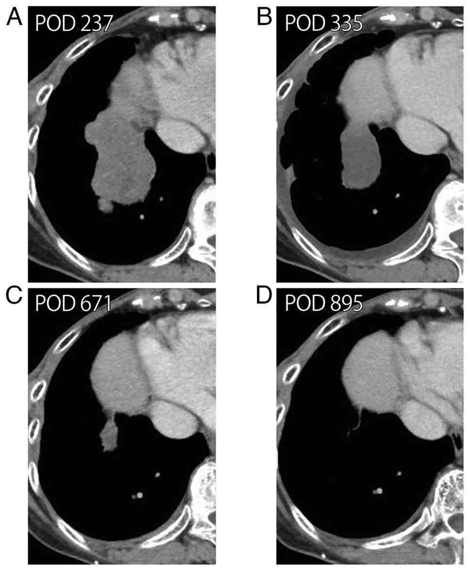 Adjuvant therapy with carboplatin and paclitaxel was administered intravenously on postoperative days 84 and 121. The regimen consisted of carboplatin (300 mg/body kg) and paclitaxel (290 mg/body kg). Although the standard interval between cycles is 3 weeks, the second cycle was delayed, resulting in a 37-day interval. However, due to the advanced age of the patient, severe bone marrow suppression and anorexia, chemotherapy was discontinued after the second cycle. A follow-up contrast CT scan 8 months after surgery revealed local recurrence of TC in the anterior mediastinum and multiple pulmonary metastases (Fig. 4A) with pleural dissemination and right hilar lymph node metastases. However, the patient could not tolerate further chemotherapy.