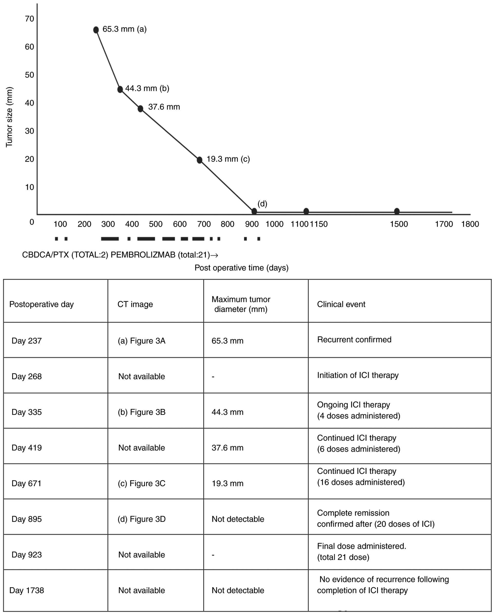 Pembrolizumab (200 mg/dose) was initiated 9 months after surgery and administered intravenously every 3 weeks for total of 21 cycles over 1 year and 9 months, without any immune-related adverse events. A timeline of the tumor response and pembrolizumab monotherapy is presented in Fig. 5. Subsequently, at 1.5 years after the initiation of pembrolizumab treatment, chest CT revealed that the recurrent lesions, including those in the anterior mediastinum, multiple pulmonary metastases, pleural dissemination and right hilar lymph node metastases, had almost completely disappeared (Fig. 4B-D). A total of 4 years and 9 months after the initial surgery, the patient is alive without recurrence.