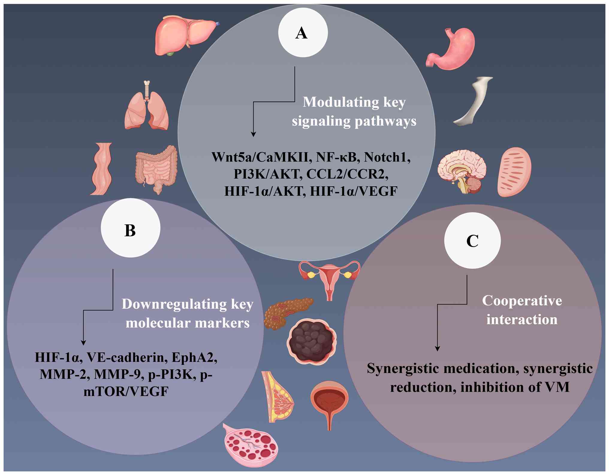 Using TCM monomers to target VM for cancer therapy offers various advantages: i) Direct inhibition of the expression of VM-related molecules presents a clear mechanism of action explaining their therapeutic effect; ii) VM is markedly associated with poor prognosis in patients with cancer and TCM monomers can suppress tumor aggressiveness and metastasis by inhibiting VM formation; iii) targeting VM, a key contributor to anti-angiogenic therapy resistance, using TCM monomers enhances antitumor efficacy by overcoming this adaptive escape mechanism; iv) TCM monomers have multi-targeting effects and can simultaneously affect multiple molecules and signaling pathways associated with VM; v) research on the role of TCM monomers in inhibiting VM provides key clues for the development of novel antitumor drugs; and vi) TCM monomers often originate from natural plants, with the cost of their extraction and preparation being relatively low compared with that of traditional antitumor drugs, such as chemotherapeutic drugs and targeted drugs, which are costly and expensive to develop, produce and evaluate in clinical trials. Monomers are more readily available in several countries and regions, and particularly for patients with a poorer financial situation, TCM monomers may be a more economical option.