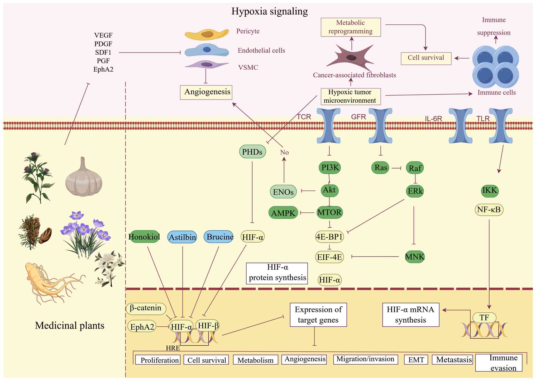 Astilbin (AST), a bioactive dihydroflavonol glycoside, is widely distributed in medicinal plants and dietary sources, exhibiting diverse pharmacological properties that have garnered notable research interest (100,101). AST demonstrates concentration-dependent anti-angiogenic and apoptosis-inducing activities in breast cancer cell lines (MCF-7 and MDA-MB-231) through dual inhibition of HIF-1α expression and subsequent VEGF signaling pathway activation. This inhibition concomitantly downregulates angiogenesis-associated markers (VE-CAD, N-cadherin and MMP-2) and reduces VM lumen formation, while inducing tumor cell apoptosis through HIF-1α/VEGF pathway modulation (102).