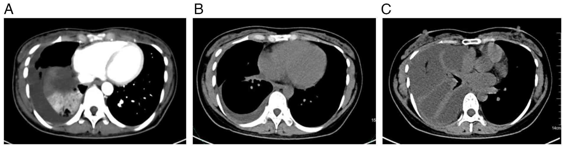 After 8 months of furmonertinib treatment (April 2024), a CT scan of the upper abdomen and pelvic cavity (Fig. 1B) indicated that the mass near the hilum of the right lung was markedly smaller compared with that at baseline, and the enlarged lymph nodes in the mediastinum were no longer detectable. Furthermore, the multiple small nodules in the right lung were reduced in size and the inflammation in both lungs had resolved. There was also notable improvement in the right lung cancer lymphadenitis, right pleural thickening and pleural effusion.