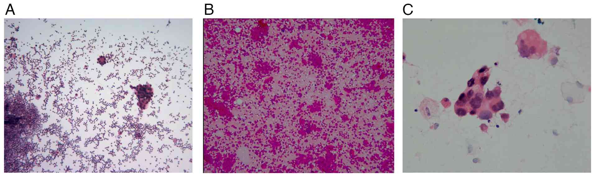 In August 2023, a 36-year-old female patient presented to a general physician in The People's Hospital of Tiantai County (Taizhou, China) with a cough and asthma that had persisted for >1 month. A lung CT scan (Fig. 1A) revealed a mass near the hilum of the right lung, suggesting a malignant tumor with partial atelectasis of the right lower lung. A thoracic puncture and drainage were performed. Cytopathology of centrifugal smears from the right pleural effusion and from bronchoalveolar lavage fluid-a diagnostic technique that analyzes fluid retrieved from the alveolar surface-revealed red blood cells, inflammatory cells and heterogeneous cell clusters, findings diagnostic for adenocarcinoma (Fig. 2). Genetic analysis (Data S1) detected an EGFR exon 19 deletion [c.22402254del; p.L747T751del; variant allele frequency (VAF)=8.49%] and an exon 20 T790M mutation (c.2369C>T; p.T790M; VAF=10.53%). Following the Chinese Society of Clinical Oncology and National Comprehensive Cancer Network guidelines for lung cancer (7,8), the patient was treated with furmonertinib (80 mg once daily in the morning), a third-generation targeted antitumor therapy.