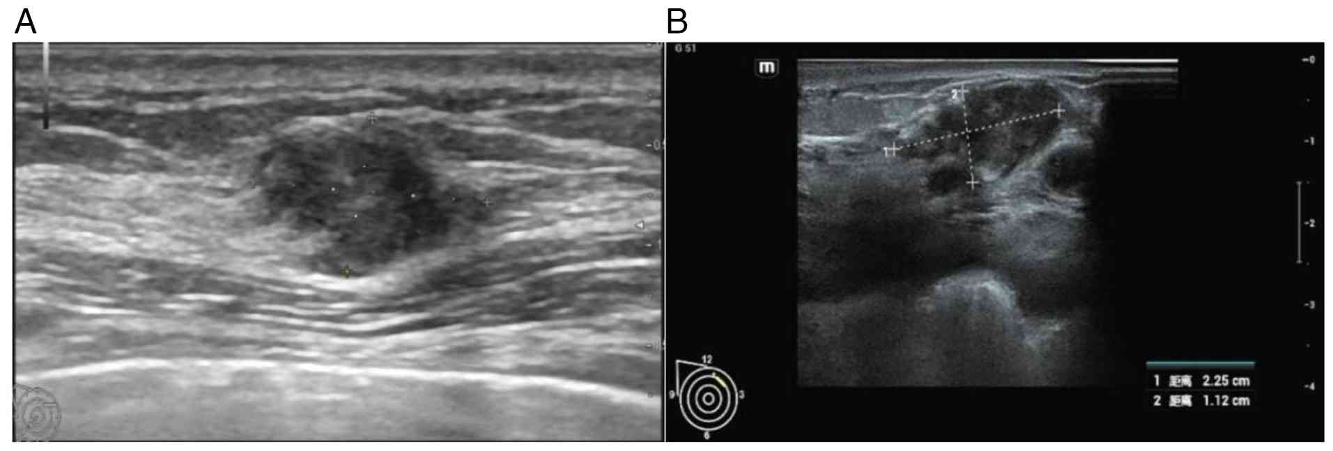 A right breast tumor was incidentally identified 1 month after a CT scan (June 2024). A color Doppler ultrasonography examination revealed a solid mass in the right breast, classified as Breast Imaging Reporting and Data System (BI-RADS) category 4A (Fig. 3A) (9). The right breast tumor was resected under local anesthesia. Based on postoperative pathology, immunohistochemistry (IHC) results and clinical history, the tumor was diagnosed as breast cancer secondary to a primary lung adenocarcinoma. An intravascular tumor thrombus was observed. IHC results (Data S1) demonstrated that the patient was positive for CK7, Ki-67 (~60% +), Napsin A and thyroid transcription factor 1 (TTF-1) and negative for estrogen receptor, progesterone receptor, CK5/6, Sox10, GATA binding protein 3, mammaglobin and HER2 (Fig. 4).