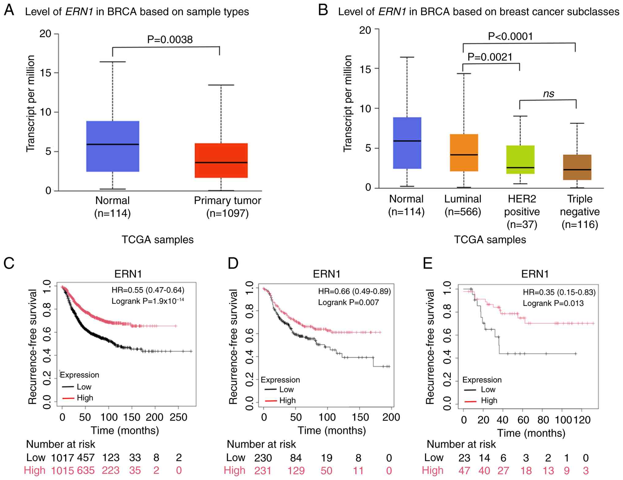 Bioinformatics analysis was performed using web-based bioinformatics tools. ERN1 levels in normal and breast cancer samples, as well as the profiles of ERN1 levels in different molecular subtypes of breast cancer, were analyzed using the online University of ALabama at Birmingham CANcer data analysis Portal (UALCAN) (19) (https://ualcan.path.uab.edu/). The levels of ERN1 in several malignant tumors were analyzed based on the web tool Gene Expression Profiling Interactive Analysis 2 (20) (http://gepia2.cancer-pku.cn). The online Kaplan-Meier Plotter (21) (http://kmplot.com/analysis) was employed to analyze recurrence-free survival differences between ERN1-high and -low groups in both overall breast cancer and HER2-positive subtypes, using the default parameters (probe: 227755_at; cut-off: median) based on its integrated breast cancer gene expression dataset. For TNBC-specific analysis, the GSE21653 dataset (available within the Kaplan-Meier Plotter tool) (22) was selected, applying the ‘auto-select best cut-off’ function.