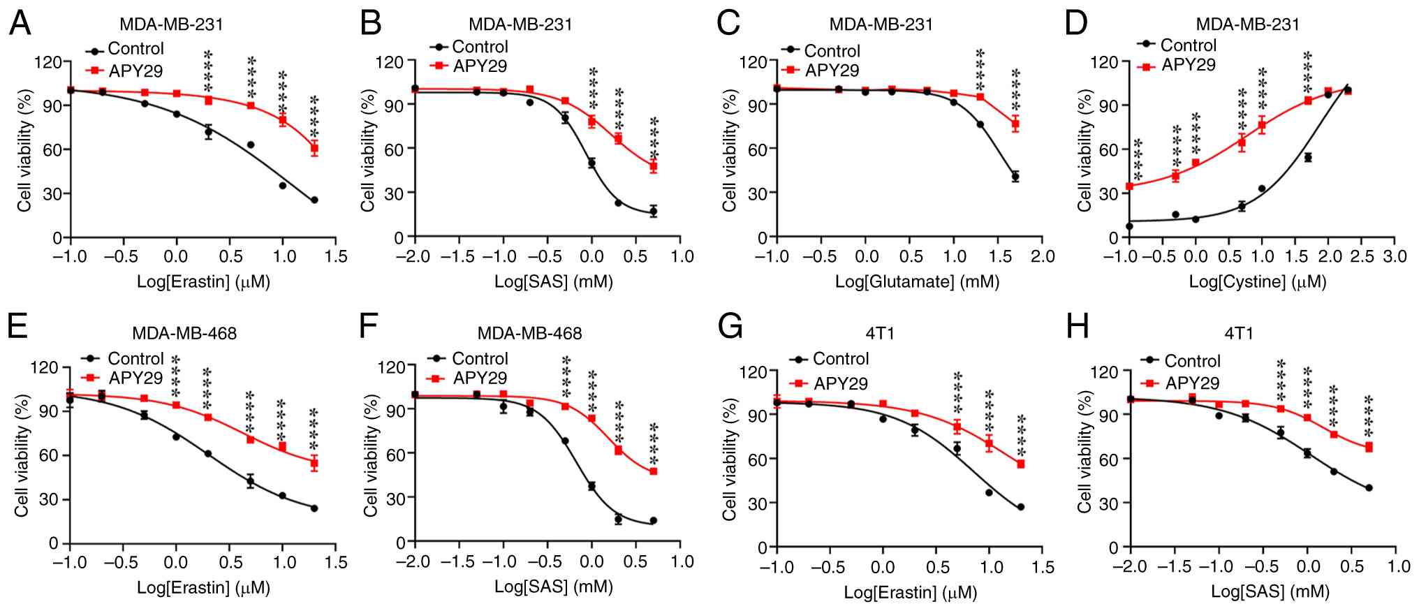 MDA-MB-231, MDA-MB-468 and 4T1 cells were treated with APY29 (200 nM) for 24 h at 37°C and subsequently harvested. Total RNA was isolated using TRIzol reagent. cDNA was synthesized using the SuperScript IV First-Strand Synthesis System with the following protocol: 25°C for 10 min, 50°C for 10 min, and 80°C for 10 min. qPCR was performed using the SsoAdvanced Universal SYBR® Green SuperMix (cat. no. 1725270; Bio-Rad Laboratories, Inc.). The thermocycling conditions were as follows: initial denaturation at 95°C for 30 sec, followed by 40 cycles of 95°C for 15 sec and 60°C for 30 sec. Gene expression was normalized to the endogenous reference gene GAPDH using the 2−∆∆Cq method (23). The results are expressed as fold changes relative to the control group. Primer sequences used for qPCR were as follows (24): xCT forward, 5′-TGTGTGGGGTCCTGTCACTA-3′; xCT reverse, 5′-CAGTAGCTGCAGGGCGTATT-3′; GAPDH forward, 5′-ATGGGGAAGGTGAAGGTCG-3′; and GAPDH reverse, 5′-GGGGTCATTGATGGCAACAATA-3′.