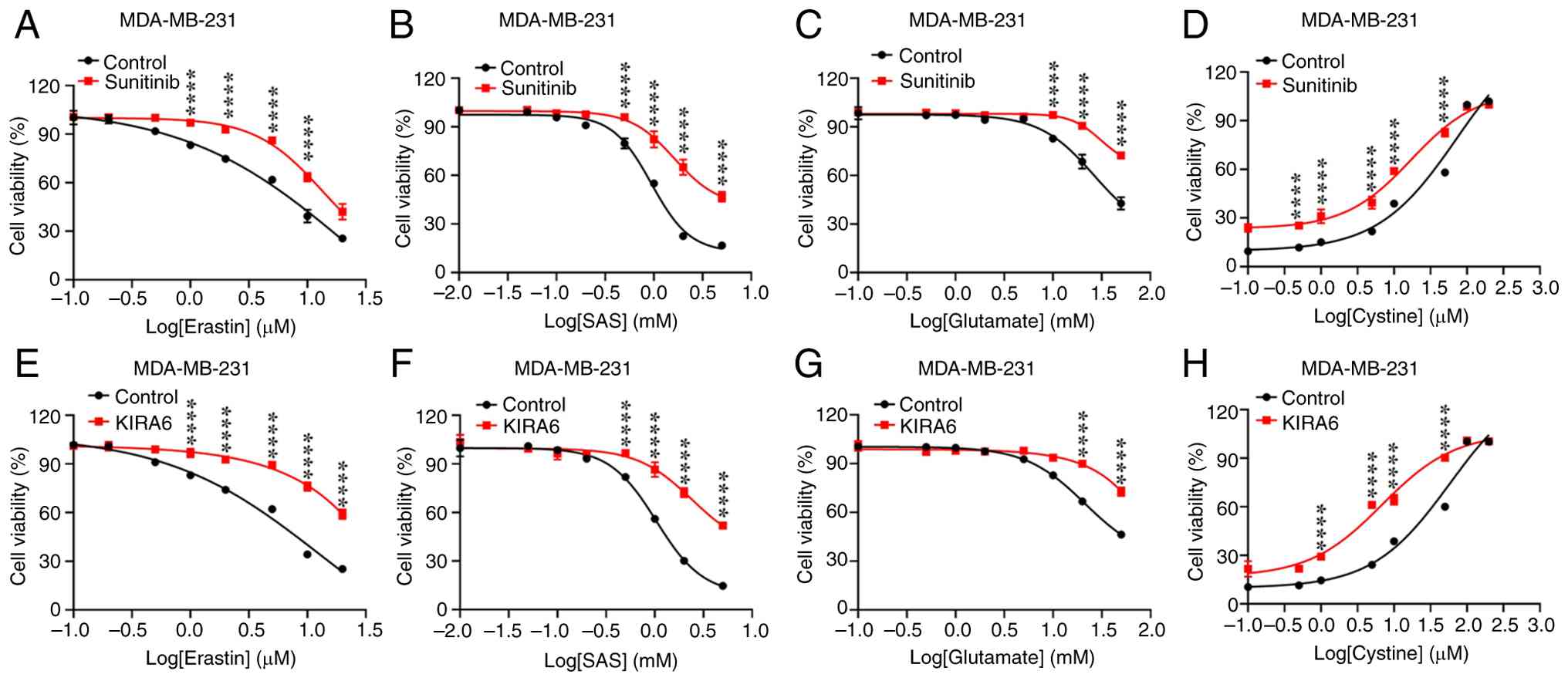 The present study further selected two known IRE1α modulators, sunitinib [a type I inhibitor that suppresses IRE1α kinase activity without affecting its RNase function (30)] and KIRA6 [an ATP-competitive IRE1α kinase inhibiting RNase attenuator (31)], for subsequent investigations. First, the cytotoxicity of these compounds was evaluated in MDA-MB-231 cells (Fig. S2E and F). Subsequent experiments were then performed at non-toxic concentrations (sunitinib at 0.2 µM; KIRA6 at 0.5 µM). The results revealed that sunitinib significantly suppressed the ferroptosis induced by erastin, SAS, glutamate or cystine restriction (Fig. 3A-D; P<0.0001 vs. Control at key concentrations). Similarly, KIRA6 exerted marked cytoprotective effects (Fig. 3E-H; P<0.0001 vs. Control at key concentrations). These findings suggest that targeting the IRE1α kinase signaling pathway may represent an effective strategy for modulating ferroptosis.