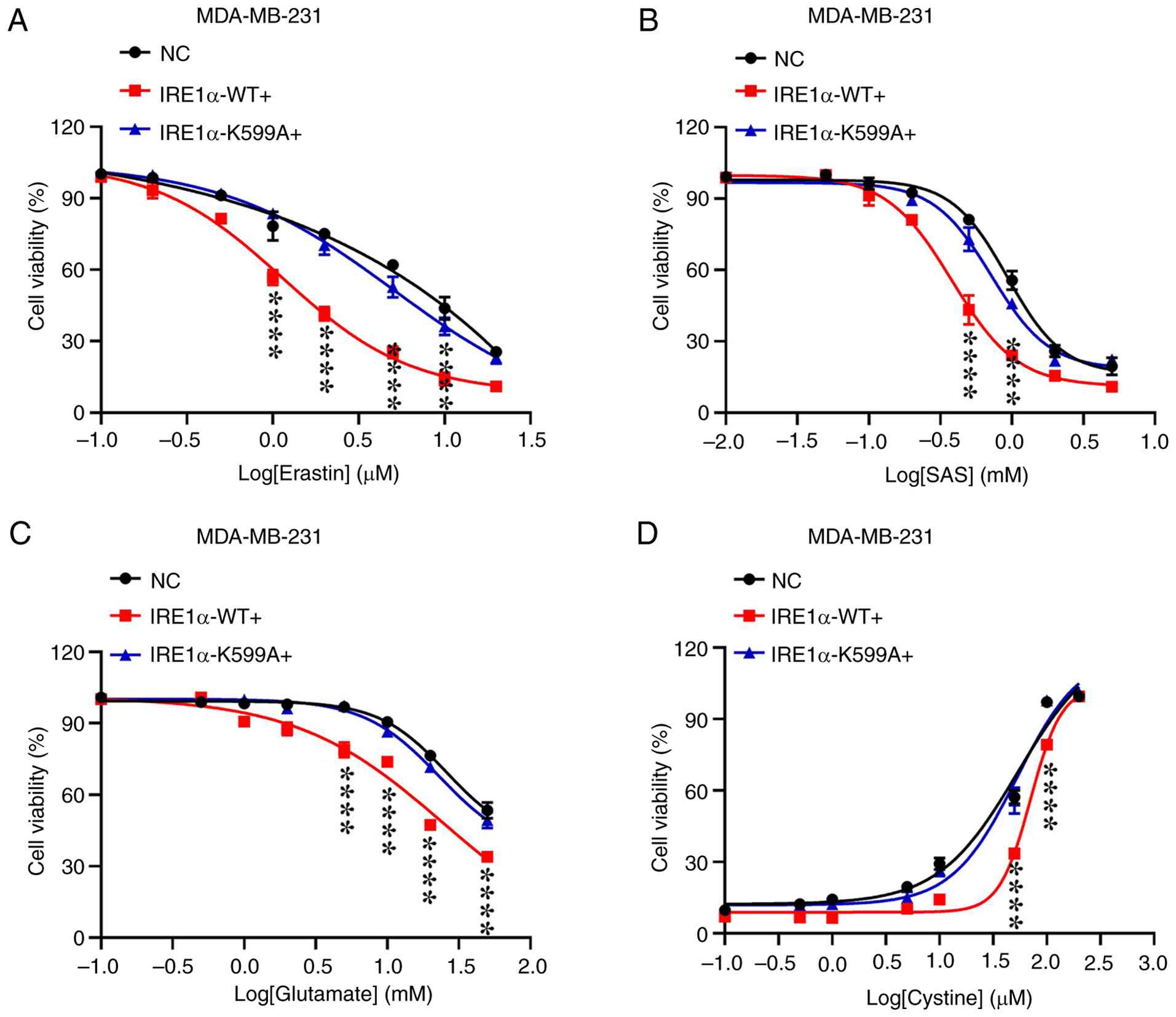 To further investigate the role of IRE1α kinase in ferroptosis in MDA-MB-231, the present study established stable cell lines overexpressing either IRE1α-WT or IRE1α-K599A, which abolishes the kinase function of IRE1α (Fig. S4). Subsequent drug resistance assays demonstrated that, compared with the control cells, the overexpression of IRE1α-WT significantly enhanced cellular sensitivity to ferroptosis induced by several stimuli, including erastin, SAS, glutamate and cystine restriction. By contrast, the overexpression of the kinase-dead mutant (IRE1α-K599A) did not exert a significant effect on ferroptosis sensitivity (Fig. 4; P<0.0001 for IRE1α-WT vs. NC, P>0.05 for IRE1α-K599A vs. NC at key concentrations). Taken together, these findings demonstrate that the overexpression of IRE1α-WT, but not the kinase-dead mutant increased the sensitivity of TNBC cells to ferroptosis.