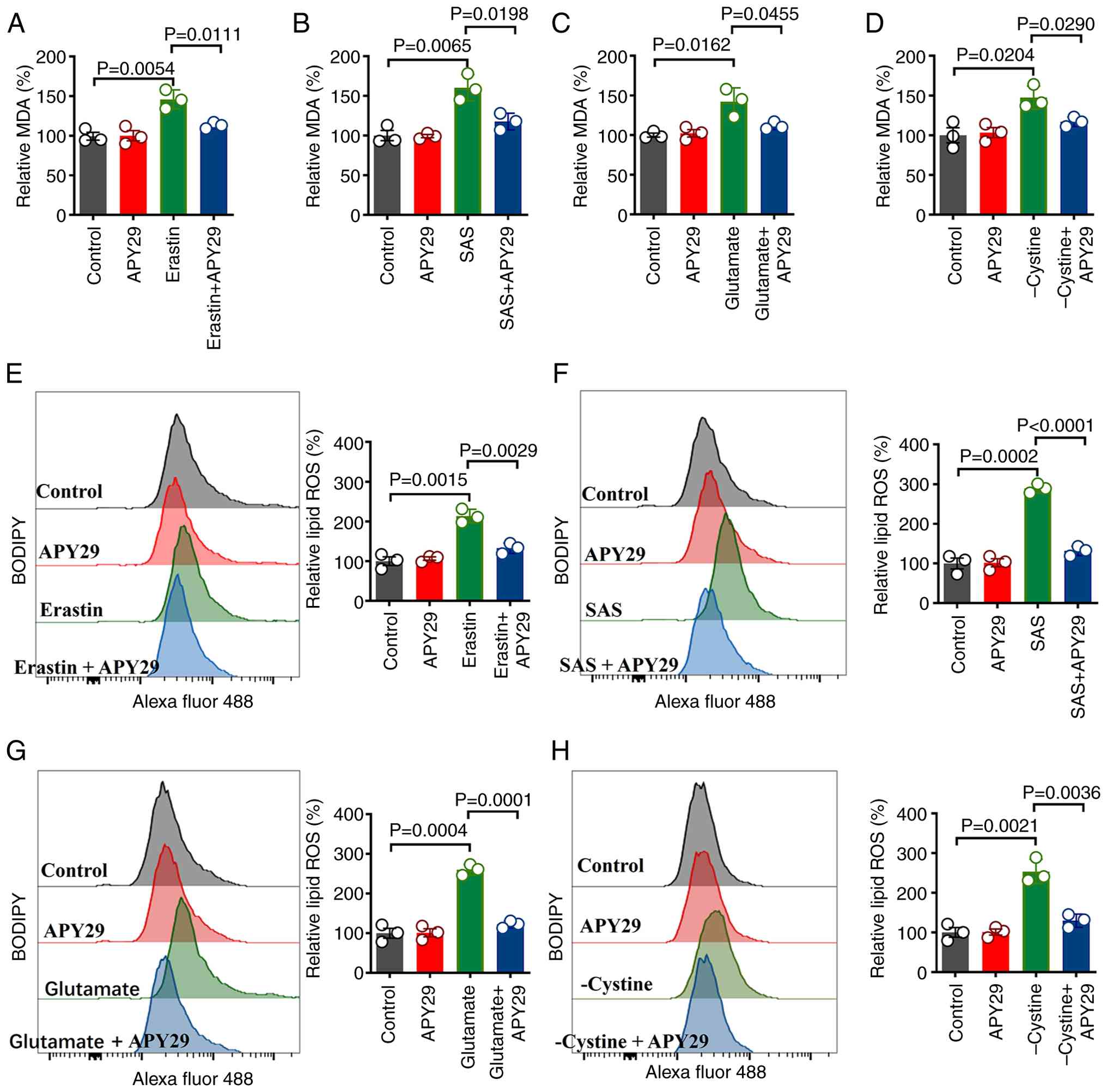 Cellular MDA levels were assessed using a Lipid Peroxidation Assay Kit (cat. no. ab233471; Abcam), as previously described (14). Briefly, cells were treated with compounds (Erastin, 2 µM; SAS, 1 mM; glutamate, 20 mM; APY29, 200 nM) for 12 h at 37°C. Samples and the MDA color reagent were added to the wells and incubated for 20 min at room temperature. Following this, the reaction solution was introduced, and the mix was incubated for 60 min at room temperature. The resulting product was subsequently assessed at 695 nm using an absorbance microplate reader.