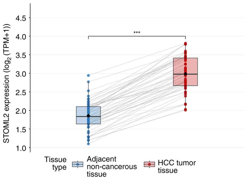 At the tissue level, numerous studies have demonstrated that both STOML2 mRNA transcripts and STOML2 protein levels are notably higher in HCC tissues compared with those in adjacent normal liver tissues, as evidenced by techniques including reverse transcription-quantitative PCR, western blotting and immunohistochemistry (17,18). In the present study, a paired comparative analysis of STOML2 transcript levels was performed using the aforementioned TCGA-LIHC cohort. As shown in Fig. 2, the log2(transcripts per million +1) value of STOML2 was significantly higher in HCC tumor tissues compared with that in matched adjacent non-cancerous tissues from the same patients (P<0.001). The statistical significance was determined using a paired two-tailed Student's t-test, which is appropriate for comparing the means of two related (paired) samples. This finding, derived from analysis of TCGA-LIHC dataset, further demonstrated the abnormal upregulation of STOML2 in HCC at the transcriptional level.