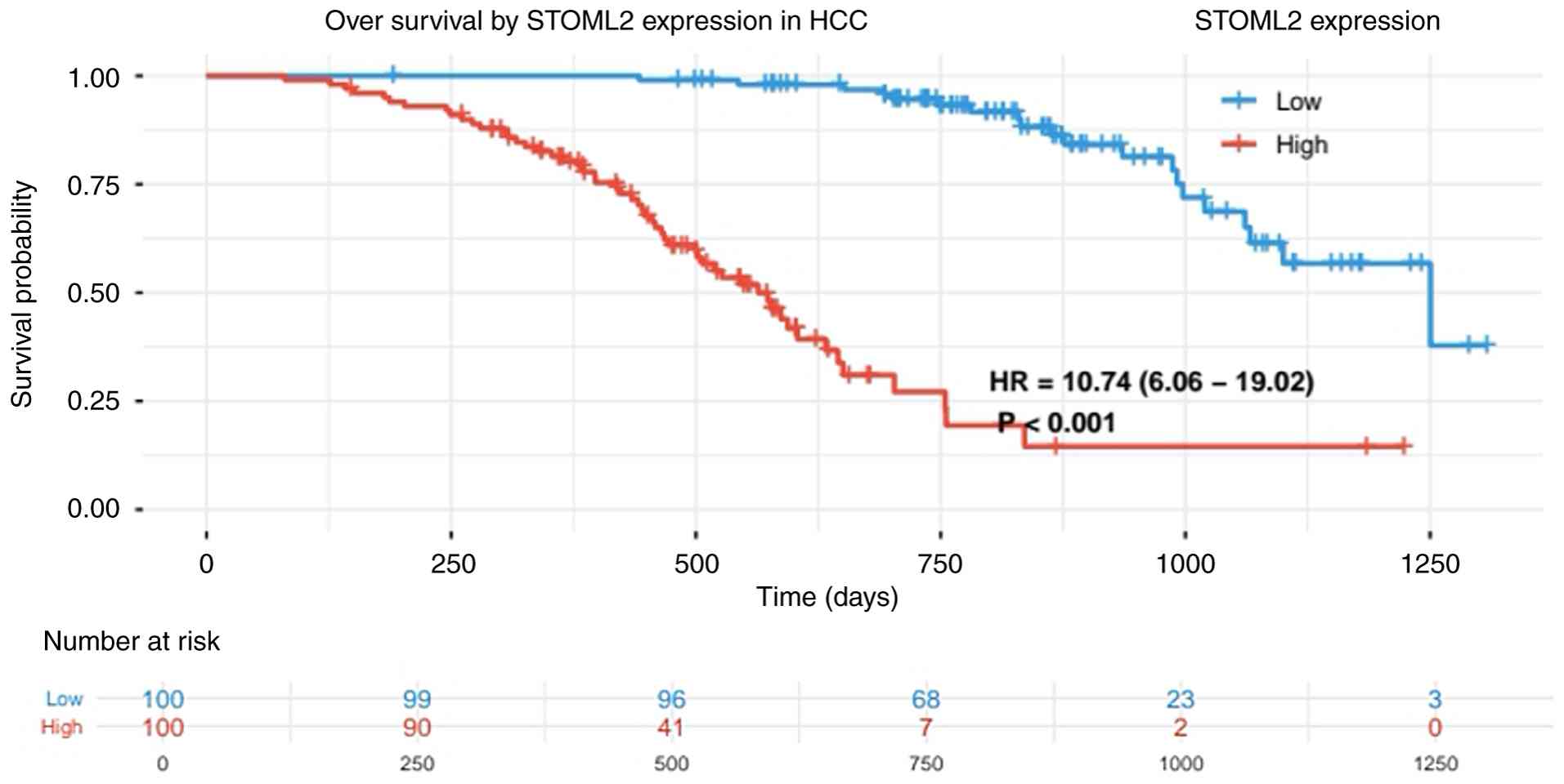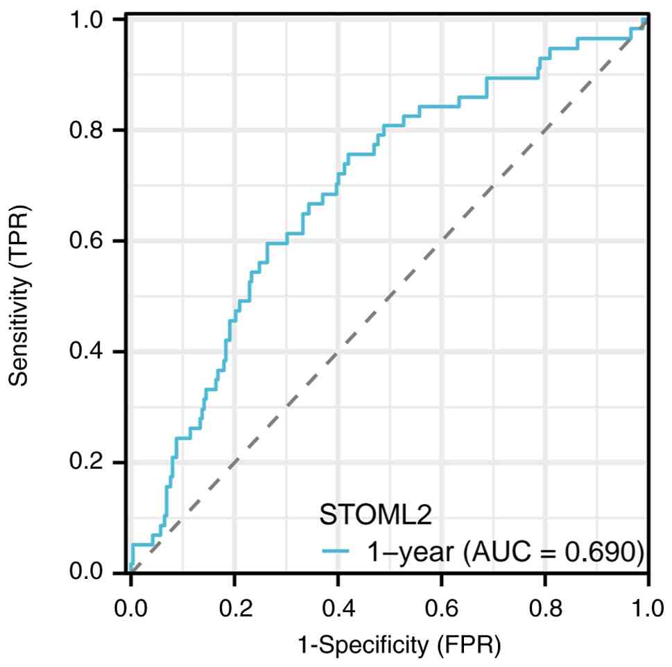 High STOML2 expression is markedly associated with multiple adverse clinical and pathological characteristics in patients with HCC. Patients with elevated STOML2 expression tend to exhibit larger tumor volumes, where its expression levels progressively increase with advancing TNM staging, particularly in patients with stage III–IV disease (21). In terms of histological differentiation, STOML2 expression is generally higher in poorly differentiated HCC tissues compared with that in moderately or well-differentiated groups, suggesting that its expression level is associated with the degree of tumor malignancy (22). Notable upregulation of STOML2 has been observed in patients with HCC and MVI or portal vein tumor thrombus, further indicating the potential involvement of this protein in HCC invasion (23). High STOML2 expression is also associated with an increased risk of lymph node metastasis, since its expression levels have been shown to be markedly higher in cases with extrahepatic metastasis compared with those in patients who are non-metastatic. In one previous study, the STOML2 protein exhibited a significantly higher positive expression rate in the distant metastasis group compared with that in the non-metastatic group (94.4 vs. 58.3; P<0.05), suggesting a potential positive association between STOML2 and distant tumor metastasis (24). To specifically evaluate the prognostic impact of STOML2 in HCC, an independent survival analysis was conducted using TCGA-LIHC cohort. The analysis utilized the full dataset from TCGA-LIHC project, comprising RNA-seq and clinical data for 371 patients. As in previous analyses, patients were dichotomized into STOML2-high and STOML2-low expression groups based on the median expression value of STOML2 mRNA across the cohort. Survival curves were generated using the Kaplan-Meier method, and differences in overall survival distributions between groups were compared using the Renyi test (a variant of the Cramér-von Mises test). This rank-based test is sensitive to early differences in survival, and was applied with the standard parameter setting (ρ=0.5) to weight such early deviations. The analysis demonstrated that STOML2 expression was significantly associated with the overall survival of patients with HCC. As shown in Fig. 3, the overall survival of patients in the STOML2-high expression group was significantly lower compared with that in the low-expression group (P<0.001), with a hazard ratio of 10.74 (95% CI, 6.06–19.02). This indicates that high STOML2 expression is an independent adverse prognostic factor for HCC. Collectively, these findings suggest that STOML2 serves a key role in the progression and metastasis of HCC. To further evaluate the dynamic prognostic accuracy of STOML2, a time-dependent receiver operating characteristic (ROC) curve analysis was conducted. This analysis utilized the same TCGA-LIHC cohort (comprising RNA-seq and clinical data for 371 patients with HCC), ensuring consistency with the preceding survival analysis. STOML2 mRNA expression levels, represented as continuous log2 (transcripts per million + 1) values, served as the sole predictive variable. The primary outcome was 1-year overall survival. The analysis was performed using R software (version 4.3.1); specifically, the timeROC package (version 0.4) was employed to compute the time-dependent ROC curves and the corresponding area under the curve (AUC) value at the 1-year time point. The timeROC package implements a nonparametric inverse probability of censoring weighting estimator for calculating time-dependent sensitivity and specificity, which properly accounts for right-censored survival data. The package is publicly available from the Comprehensive R Archive Network at https://CRAN.R-project.org/package=timeROC. As shown in Fig. 4, the AUC value of STOML2 for predicting 1-year overall survival was 0.690. An AUC value exceeding the chance-level threshold of 0.5 indicates predictive capacity, with the observed value of 0.690 suggesting a moderate predictive efficiency of STOML2 for the short-term prognosis of HCC (25).