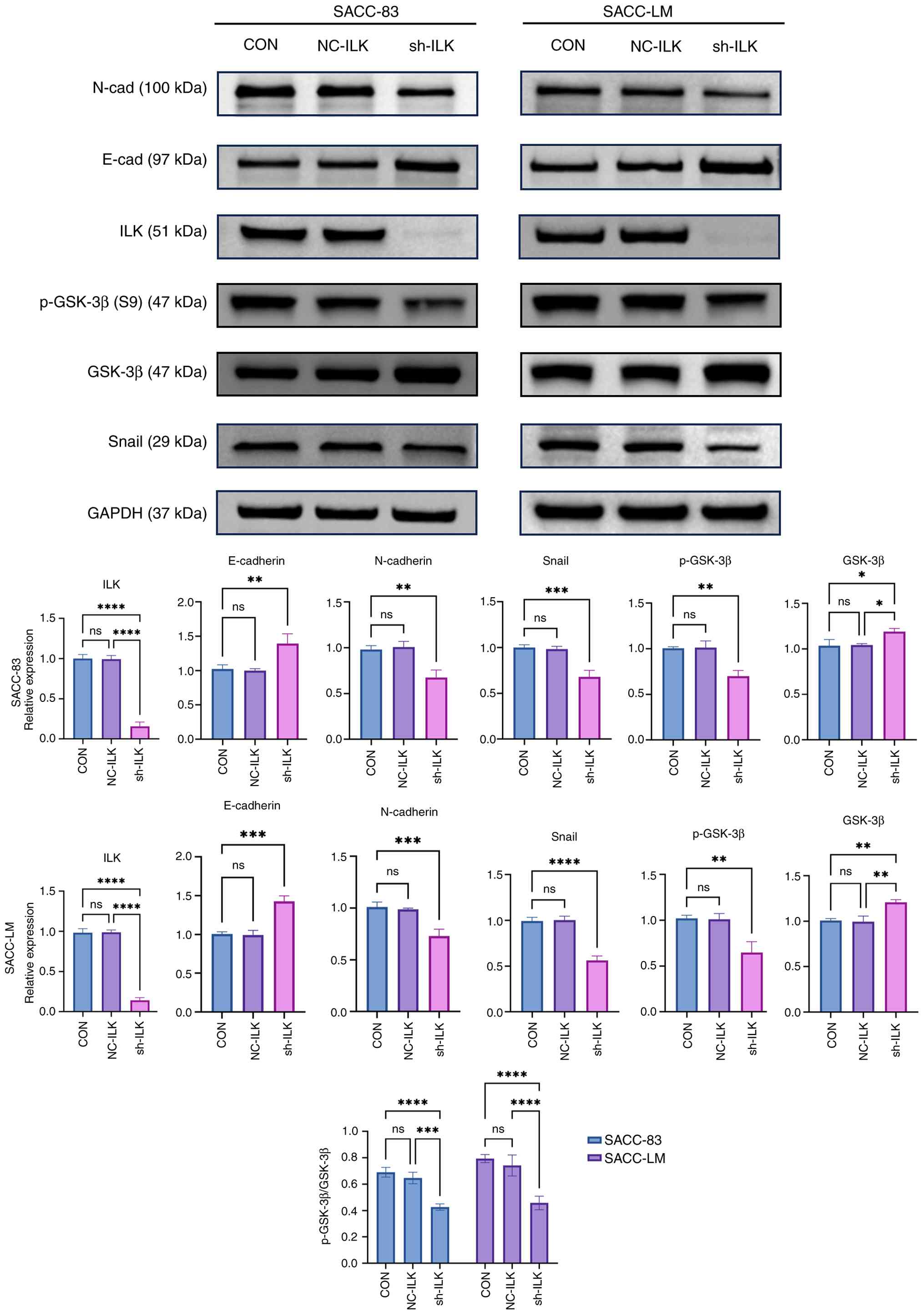 Western blot analysis of the effects of ILK knockdown on EMT markers and signaling. Results are shown as the mean ± SD of three independent assays. *P<0.05, **P<0.01, ***P<0.001, ****P<0.0001 vs. control group. ns, not significant.
