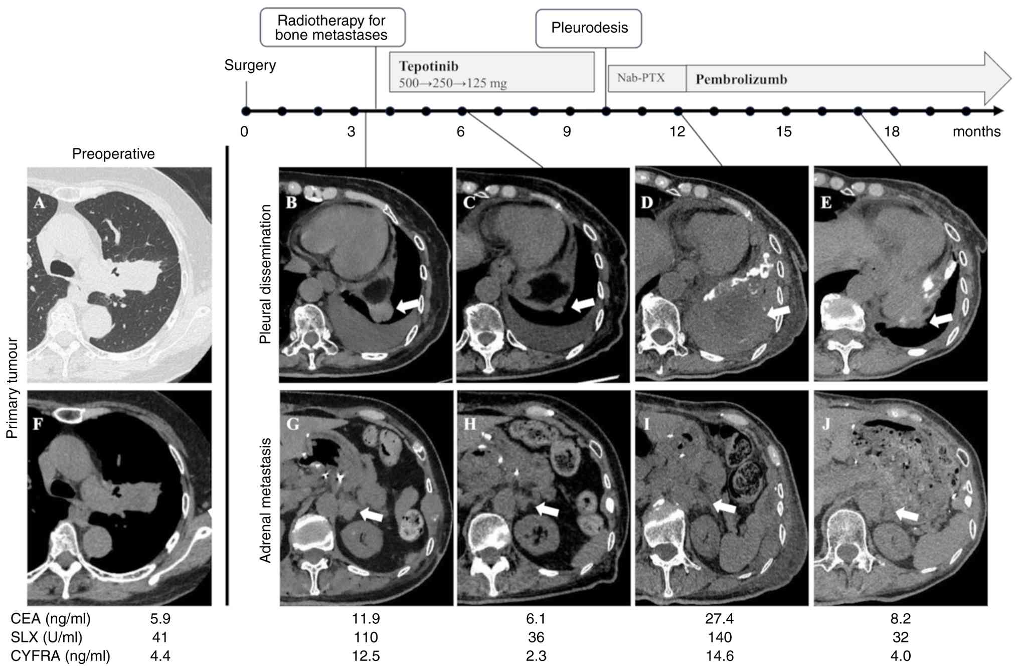 Two months after initiating tepotinib, CT imaging showed a reduction in pleural dissemination on the left diaphragm (5 mm) and in bilateral adrenal metastases (right: 5 mm, left: 12 mm) (Fig. 1C and H), and the response was assessed as a partial response (PR).