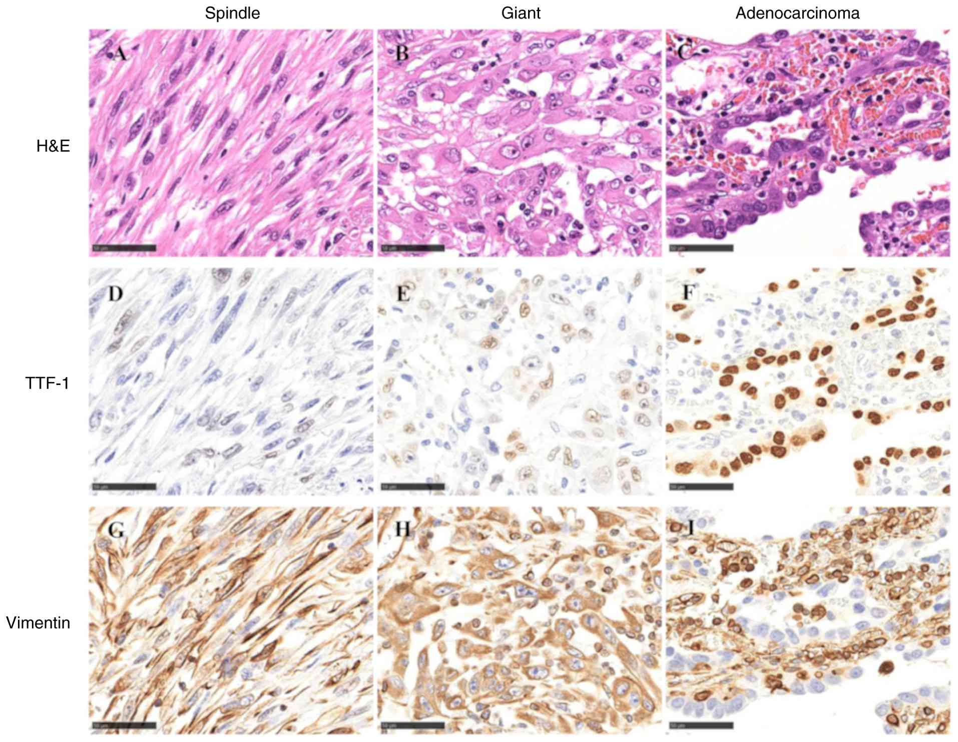Pathological examination of the resected specimen showed the presence of PPC consisting of spindle cell carcinoma (50%), giant cell carcinoma (30%), and adenocarcinoma components (20%) (Fig. 2A-C). Immunohistochemical analysis showed that the spindle cells, giant cells, and adenocarcinoma components (Fig. 2D-F) were weakly positive, weakly positive, and positive, respectively, for thyroid transcription factor-1 (TTF-1) while they were positive, positive, and negative, respectively, for vimentin (Fig. 2G-I). For haematoxylin and eosin staining, surgically resected specimens were fixed in 10% neutral buffered formalin at room temperature for 48 h. Representative tissue samples were selected, embedded in paraffin and sectioned at a thickness of 4 µm. The sections were then deparaffinized in xylene, rehydrated through a graded series of ethanol, and stained with haematoxylin for 5 min and eosin for 2 min at room temperature. Immunohistochemical staining was performed on the 4-µm sections prepared from formalin-fixed, paraffin-embedded tissue. Briefly, antigen retrieval was carried out using citrate buffer (pH 6.0) and endogenous peroxidase blocking was performed with 3% hydrogen peroxide (cat. no. 081-04215; FUJIFILM Wako Pure Chemical Corporation) for 5 min at room temperature. The primary antibodies used were TTF-1 (1:200; for 30 min at room temperature; clone SPT24; cat. no. NCL-L-TTF-1; Leica Biosystems) and vimentin (1:1; for 30 min at room temperature; clone V9; cat. no. 718511; Nichirei Biosciences, Inc.). Histofine® Simple Stain™ MAX PO (MULTI) (1:1; for 30 min at room temperature; cat. no. 424151; Nichirei Biosciences, Inc.) was used as a secondary antibody. Immunoreactivity was visualized using 3,3′-diaminobenzidine, and nuclei were counterstained with haematoxylin. All slides were examined under a light microscope.