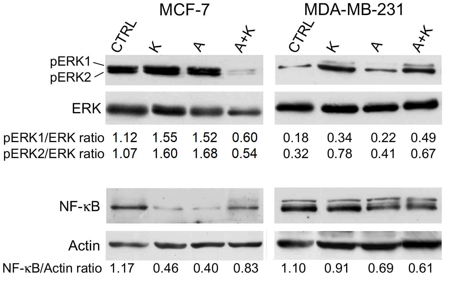 Following the publication of the above article, an interested reader drew to the authors’ attention that the ERK blots shown for the MCF-7 and MDA-MB-231 cell lines in Fig. 3 on p. 4231 were unexpectedly similar, given that the blots were intended to show the results from experiments performed on two different cell lines. Upon asking the authors for an explanation, they were able to provide the raw data underlying the figure, and they realized that the blots correctly shown for the MDA-MD-231 cell line had inadvertently been copied across for the MCF-7 cell line. The corrected version of Fig. 3, now showing the correct ERK blots for the MCF-7 cell line, is shown below. The authors regret that this error occurred during the assembly of Fig. 3, although this did not grossly affect either the results or the conclusions reported in this article. All the authors agree with the publication of this Corrigendum, and thank the Editor of Oncology Letters for granting them the opportunity to publish this; furthermore. they apologize to the readership for any inconvenience caused.