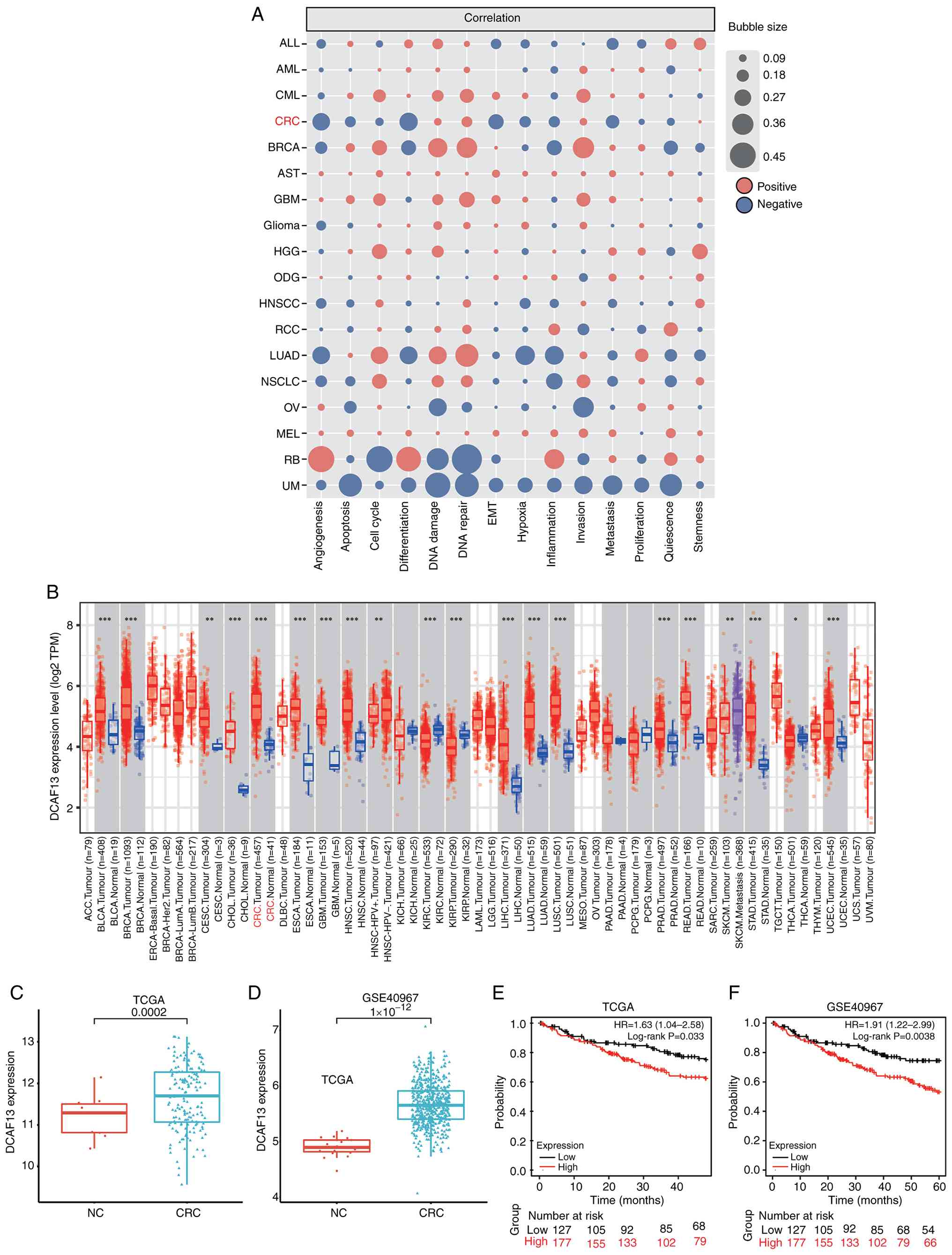 In the present study, it was shown that DCAF13 expression was upregulated in various solid tumours, including CRC. Specifically, CRC tissues exhibited higher levels of DCAF13 compared with that of adjacent normal tissues. This finding is consistent with previous studies, such as that of Ieranò et al (69), who reported elevated DCAF13 protein expression levels in CRC tissues relative to adjacent normal samples. The results of the present study, further confirmed by the results of analysis of data obtained from TCGA and the GSE40967 cohorts, as well as by the IHC staining of clinical CRC samples, corroborate these findings. Furthermore, KM survival analysis demonstrated that higher expression of DCAF13 was associated with a shorter OS in patients with CRC, suggesting that DCAF13 may serve as a prognostic biomarker. External validation with independent cohorts and IHC staining experiments of the clinical samples confirmed the robustness and reliability of this marker, further supporting its potential as a therapeutic target.