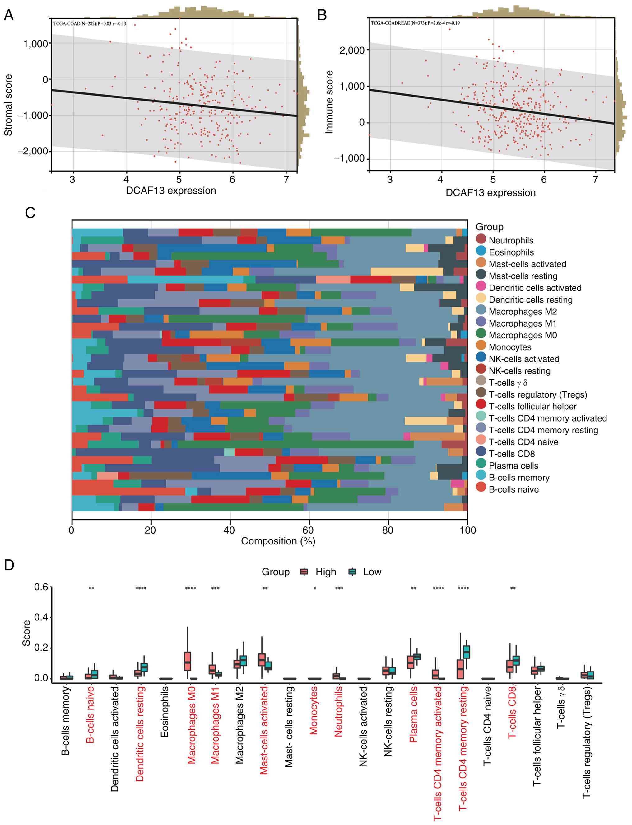 The analysis performed in the present study also identified significant differences in SSs among patients with CRC, in agreement with prior research highlighting the contribution of stromal components to tumour progression, metastasis and resistance to therapy (74,75). A significant difference in the ISs among patients with CRC was also observed, which is likely attributed to variations in the proportions of immune cell populations. These results suggested that DCAF13 expression may influence CRC progression and metastasis by modulating the immune microenvironment. Additionally, DCAF13 expression was positively correlated with immune cell populations such as M0 and M1 macrophages, activated mast cells, neutrophils and CD4+ memory T cells in CRC, further highlighting the potential application of targeting DCAF13 for improving the efficacy of immunotherapy in patients with CRC.