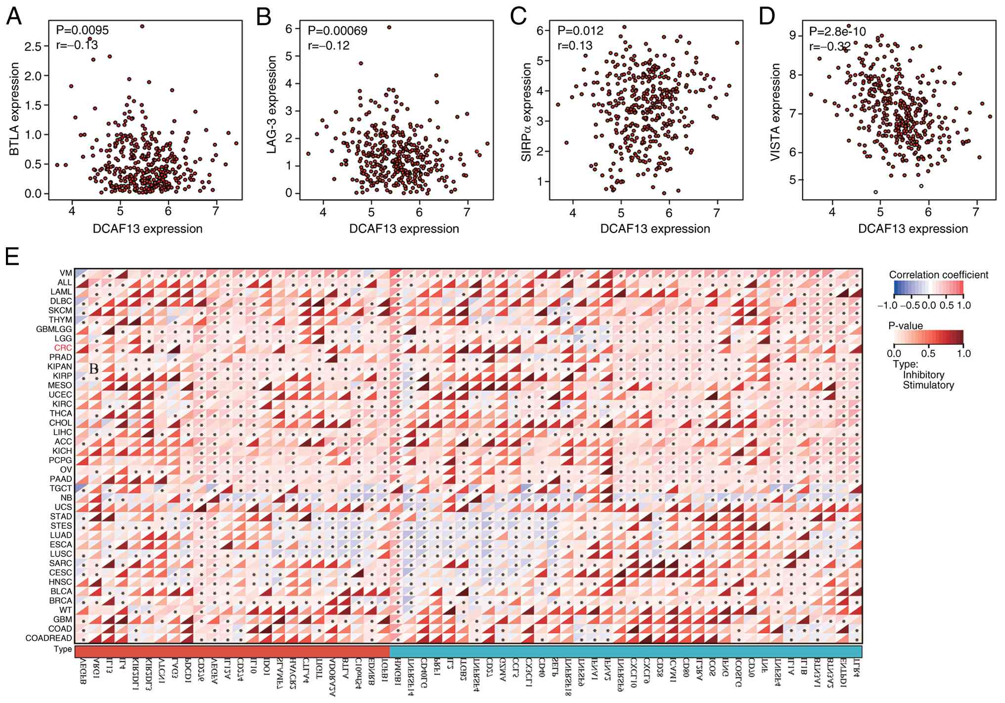 To explore the role of DCAF13 in regulating cancer immunity, its correlation with various immune checkpoints, including B and T lymphocyte attenuator (BTLA), lymphocyte-activating 3 (LAG-3), signal regulatory protein α (SIRPα) and V-domain Ig suppressor of T-cell activation (VISTA) was visualised using Gene Expression Profiling Interactive Analysis (GEPIA; http://gepia.cancer-pku.cn/) (36). Additionally, the correlation between DCAF13 expression and 122 immune checkpoint-related genes (ICPs) was analysed using Pearson's correlation analysis (37).