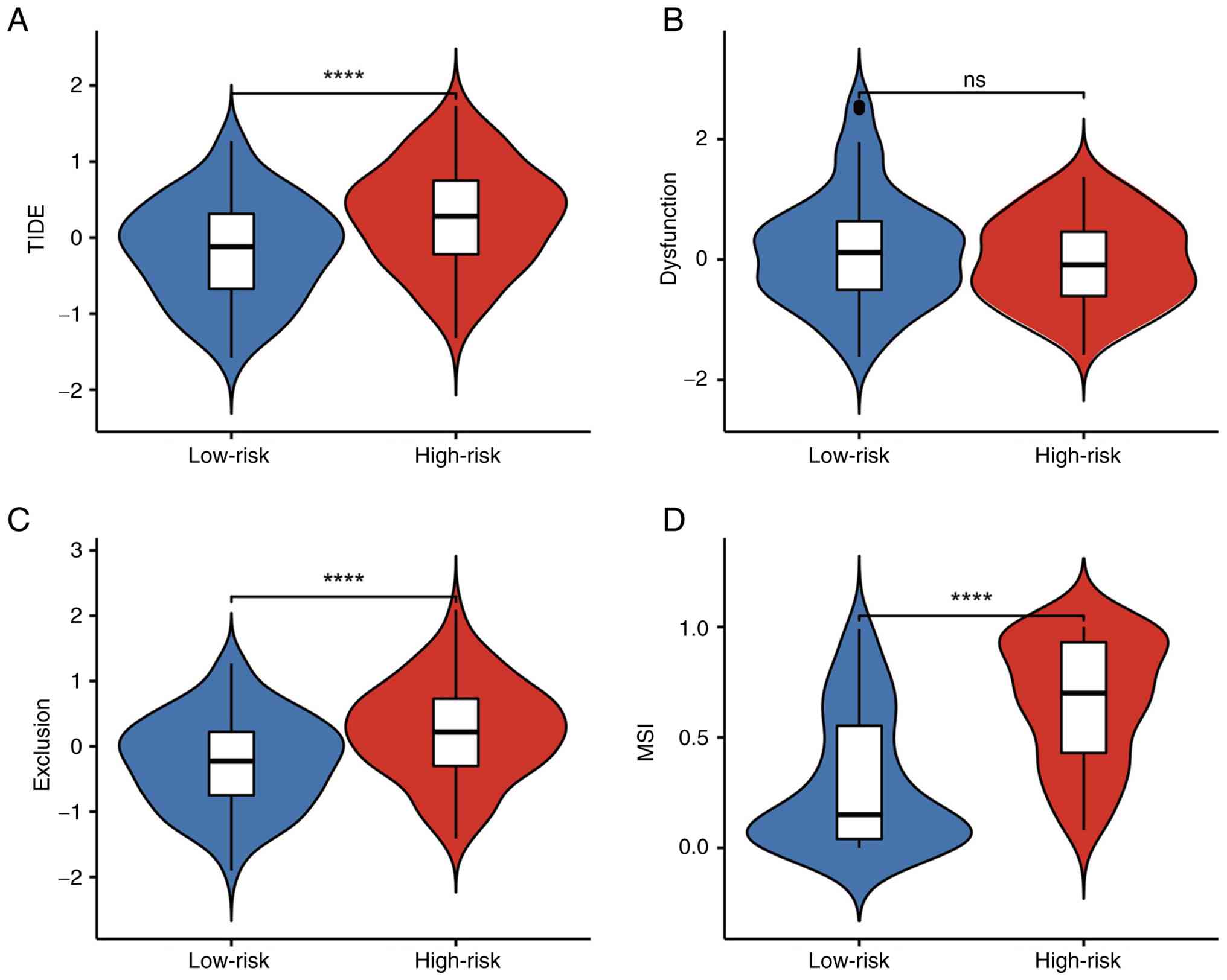 To predict the response to immunotherapy, Tumor Immune Dysfunction and Exclusion (TIDE; https://tide.dfci.harvard.edu/; accessed in March 2024) analysis was applied to the high- and low-DCAF13 expression groups (38). In the present study, the TIDE score, dysfunction score, exclusion score and MSI score between the high- and low-DCAF13 expression groups were calculated to evaluate their potential responsiveness to immunotherapy.