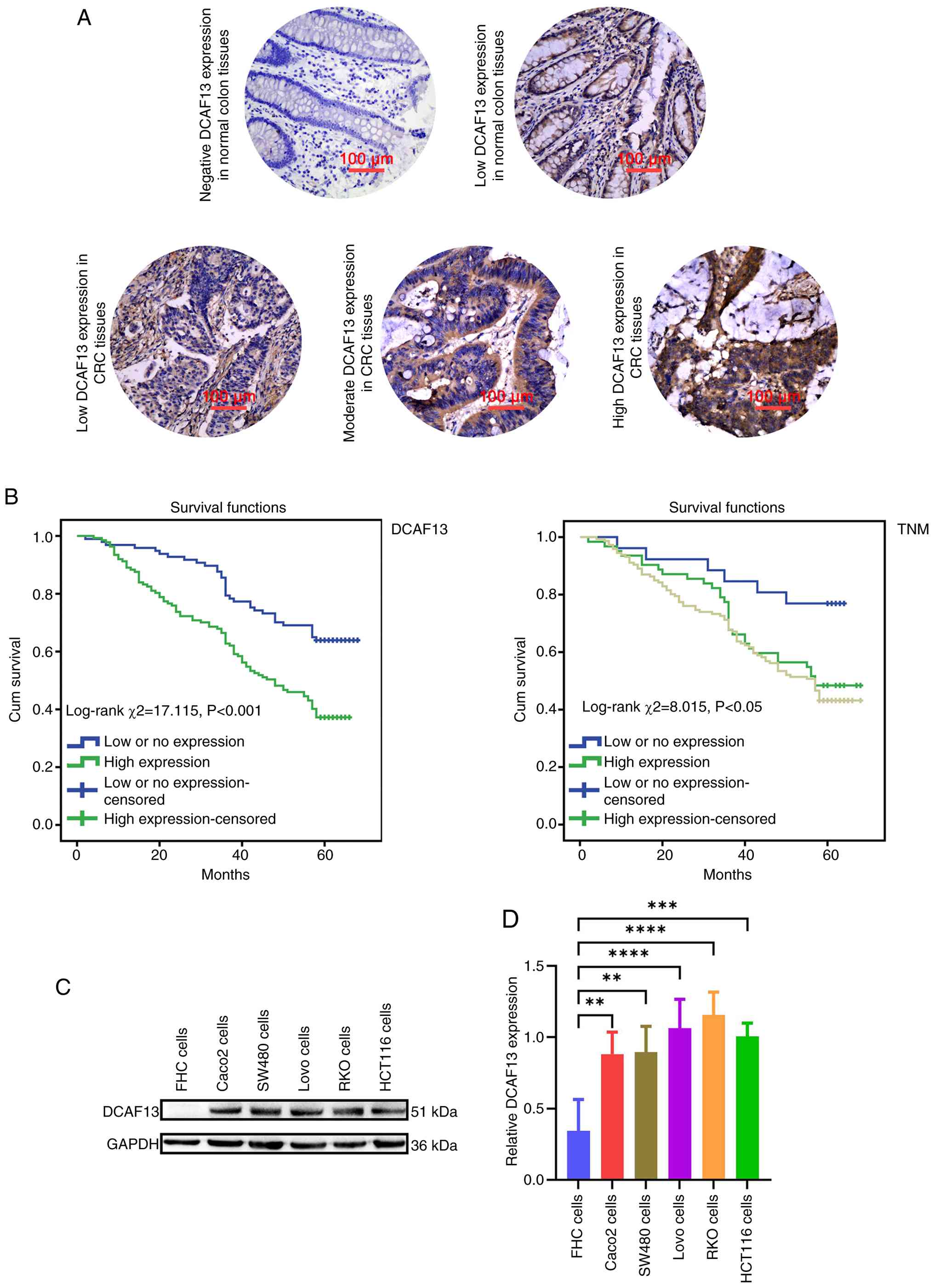 For prognostic analysis, patients in the data from TCGA (https://www.cancer.gov/ccg/research/genome-sequencing/tcga) were stratified into high- and low-expression groups based on the median expression levels of DCAF13, which served as the optimal cut-off value. The median DCAF13 expression was 11.98325, with patients exhibiting expression levels ≥11.98325 classified into the high-expression group, and those <11.98325 into the low-expression group. The association between DCAF13 expression and overall survival (OS) was evaluated using Kaplan-Meier (KM) survival analysis via the Kaplan-Meier Plotter online tool (http://gepia.cancer-pku.cn/), using the CRC mRNA dataset. Patients were stratified into high- and low-expression groups based on the median expression of DCAF13, and OS was analysed using the log-rank test. The findings were validated using the GSE40967 dataset by performing the same survival analysis on this external cohort, with patients stratified into high- and low-expression groups based on the median DCAF13 expression level within the GSE40967 cohort.