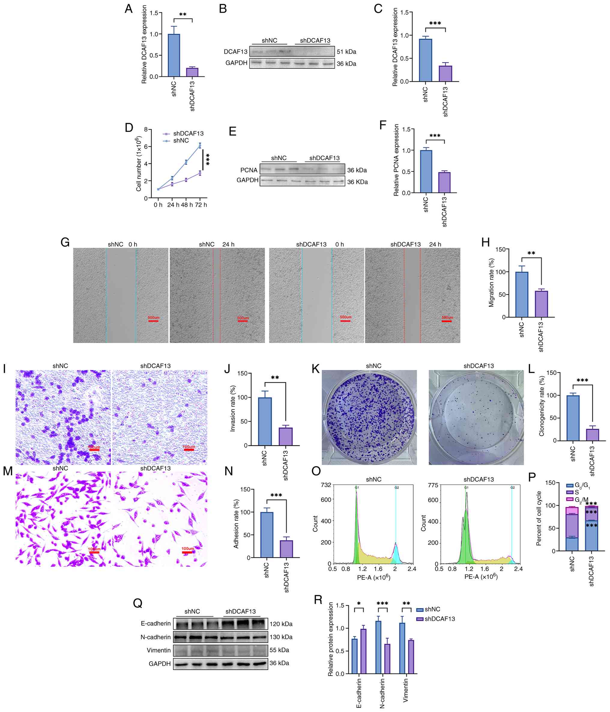 To confirm the pro-tumorigenic role of DCAF13 on CRC progression, lentivirus-mediated shRNA was used to knock down DCAF13 expression in RKO cells. RT-qPCR results confirmed that DCAF13 expression levels in the shDCAF13 were significantly reduced compared with control cells (Fig. 6A). As confirmed by western blotting analysis, DCAF13 expression levels also showed a similar reduction, validating the knockdown efficacy (Fig. 6B and C). Cell proliferation assays revealed that DCAF13 knockdown significantly impaired the proliferative potential of RKO cells (Fig. 6D). In parallel, the expression of the cell proliferation marker PCNA was significantly decreased in shDCAF13 cells, further confirming the reduction in proliferation (Fig. 6E and F). Migration assays, performed using scratch and Transwell assays, demonstrated that DCAF13 knockdown significantly abrogated the ability of RKO cells to migrate compared with that of the shNC group (Fig. 6G-J). Furthermore, the colony formation and adhesion assays showed significant reductions in the number of colonies and adherent cells following DCAF13 knockdown compared with that of the control group (Fig. 6K-N). Cell cycle distribution analysis revealed that DCAF13 knockdown induced a G1 phase arrest, indicating a disruption in cell cycle progression (Fig. 6O and P). Corresponding western blotting analysis showed that, compared with shNC cells, knockdown of DCAF13 resulted in increased expression of the epithelial marker E-cadherin and decreased expression of the mesenchymal markers N-cadherin and vimentin in CRC cells (Fig. 6Q and R), further supporting the involvement of DCAF13 in regulating EMT progression in CRC cells.