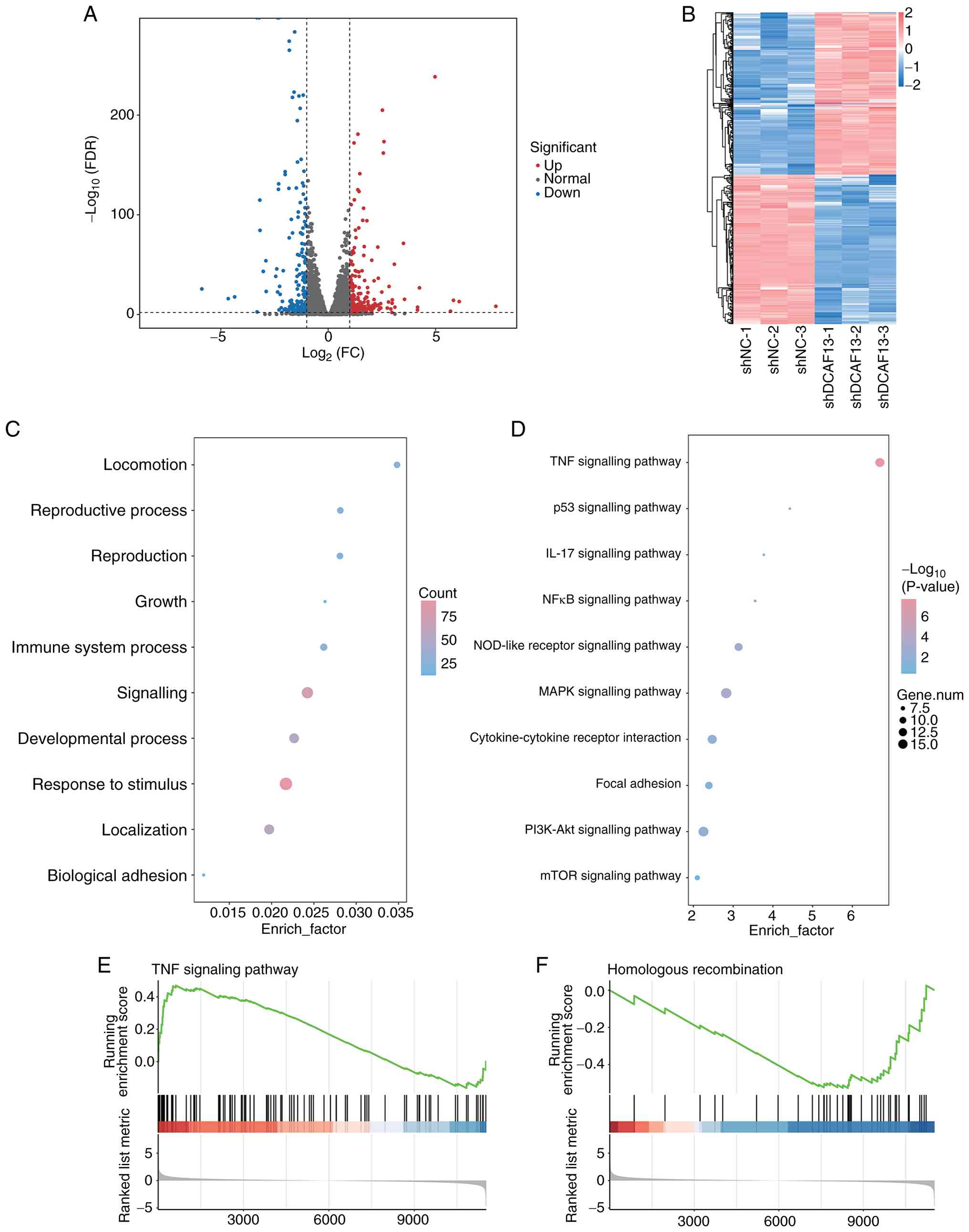 For transcriptomic analysis, total RNA was extracted from RKO cells using TRIzol® reagent (cat. no. 79306; Thermo Fisher Scientific, Inc.) according to the manufacturer's instructions (46). RNA quality and integrity were assessed using an Agilent 2100 Bioanalyzer (Agilent Technologies, Inc.), and only samples with an RNA integrity number (RIN) ≥7.0 were used for subsequent library construction. mRNA was enriched using Oligo(dT) beads, fragmented into short fragments, and reverse-transcribed into cDNA using the NEBNext® Ultra™ RNA Library Prep Kit for Illumina® (cat. no. 7530; New England BioLabs, Inc.). The resulting double-stranded cDNA fragments were end-repaired and ligated to Illumina sequencing adapters, followed by purification using AMPure XP Beads (1.0×; Beckman Coulter, Inc.) and PCR amplification. The final libraries were quantified using a Qubit™ 4 Fluorometer (Thermo Fisher Scientific, Inc.), and molar concentrations were calculated. Libraries were diluted to a final loading concentration of 8 pM prior to sequencing. Sequencing was performed on an Illumina NovaSeq 6000 platform (Illumina, Inc.) using paired-end sequencing with a read length of 150 bp (PE150). Raw sequencing data were pre-processed using fastp (version 0.18.0; http://github.com/OpenGene/fastp) to remove adapter sequences and low-quality reads. Clean reads were aligned to the human reference genome (GRCh38) using HISAT2 (version 2.4; http://daehwankimlab.github.io/hisat2/). Transcript abundance was quantified using RSEM (version 1.3.3; http://deweylab.github.io/RSEM/). Differentially expressed genes (DEGs) were identified using DESeq2 (version 1.40.2; http://bioconductor.org/packages/DESeq2/), with a false discovery rate (FDR)-adjusted P value <0.05 and an absolute log2 fold change ≥1 considered statistically significant. Functional enrichment analyses were performed using DAVID Bioinformatics Resources (version 6.8; http://david.ncifcrf.gov/). In addition, gene set enrichment analysis (GSEA) was conducted using GSEA software (version 4.3.2; Broad Institute; http://www.gsea-msigdb.org/gsea/) to identify significantly enriched biological processes and signalling pathways associated with DCAF13 regulation.