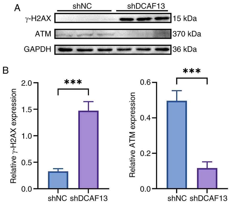 To further uncover the pro-tumourigenic effect of DCAF13 on CRC progression, the transcriptome characteristics of DCAF13 knockdown RKO cells were analysed. The results confirmed that a total of 12,652 transcripts were mined in the RKO cells between the shNC and shDCAF13 groups. The volcano plot identified 423 DEGs between the shNC and shDCAF13 groups; this comprised 219 upregulated DEGs and 204 downregulated DEGs in the shDCAF13 group when compared with the shNC group (Fig. 7A). A distinct hierarchical clustering of genes in the shDCAF13 RKO cells compared with the shNC group was demonstrated in the heat map (Fig. 7B). Conventionally, the functional GO enrichment analyses were performed to determine the overall functional implications of these identified DEGs. In terms of biological processes (Fig. 7C), the identified DEGs were predominantly involved in the subcategories of ‘locomotion’, ‘growth’ and ‘biological adhesion’. KEGG pathway enrichment analysis indicated significant involvement of multiple oncogenic and immune-related pathways, such as ‘TNF signalling pathway’, ‘MAPK signalling pathway’, ‘cytokine-cytokine receptor interaction’ and ‘NOD-like receptor signalling pathway’, which highlighted the potential role of DCAF13 in modulating tumour biology (Fig. 7D). GSEA results further demonstrated the TNF signalling pathway and homologous recombination as central regulatory pathways that potentially mediate the pro-tumourigenic effects of DCAF13 in CRC progression (Fig. 7E and F), which was further validated by the increased expression levels of γ-H2AX and decreased ATM expression levels in the shDCAF13 group when compared with that of the shNC group (Fig. 8). These results suggest an association between DCAF13 depletion and elevated DNA damage signalling.