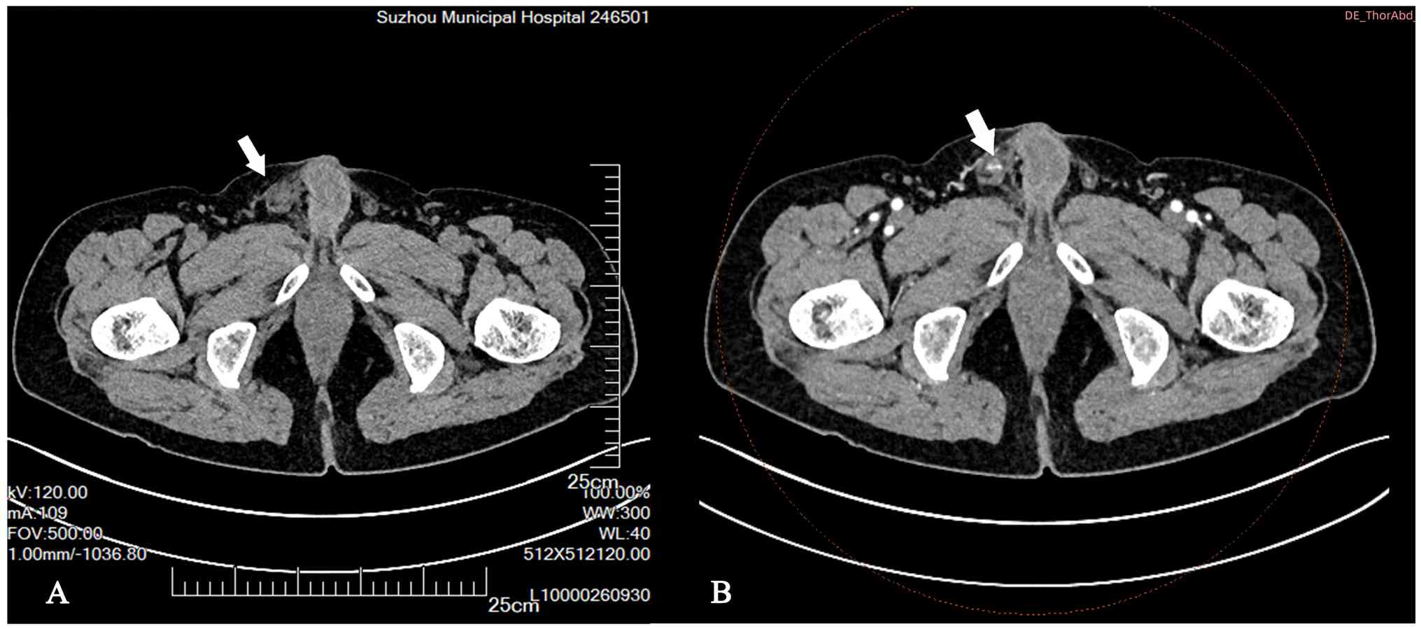 The patient was subsequently transferred to the Department of Urology of Suzhou Municipal Hospital Affiliated to Nanjing Medical University. A physical examination showed redness and swelling of the right scrotum with a slightly elevated local temperature. The epididymis was enlarged and tender, with poorly defined borders from the testis. No significant abnormalities were noted on the left side. A preliminary diagnosis of right epididymitis was made. A follow-up ultrasound scan indicated thickening of the right scrotal wall, localized fluid collection within the right tunica vaginalis cavity containing heterogeneous internal echoes, and inflammatory changes in the epididymis and surrounding tissues (Fig. S2).