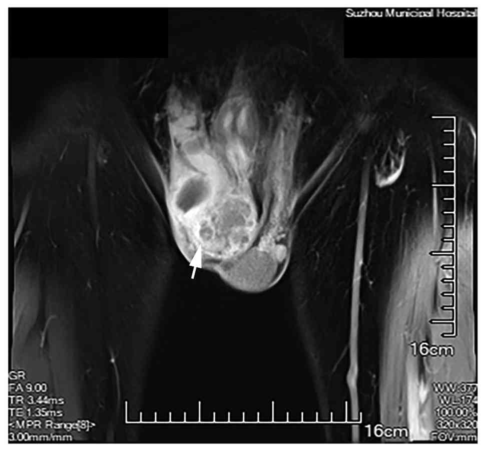 For patients with MMTVT, the most common surgical indications are a rapidly enlarging hydrocele or suspicion of testicular tumor (20). For localized MMTVT, radical inguinal orchidectomy is the treatment of choice, while inguinal lymph node dissection is warranted when signs of lymph node metastasis are present (41). For advanced or recurrent disease, radical resection combined with adjuvant chemotherapy and/or radiotherapy is recommended (23). Primary radical inguinal orchidectomy with partial scrotal resection and retroperitoneal lymph node dissection has also been proposed (13,23). It is noteworthy that the inguinal approach is preferred as it allows early control of the testicular vascular and lymphatic supply, effectively reducing the risk of tumor dissemination via the blood and lymphatics during surgery, thereby potentially lowering the local recurrence rate (42). Furthermore, cisplatin and doxorubicin have been suggested for chemotherapy (43). In a previous study focusing on MMTVT patients who underwent lymph node dissection, of the 9 patients who received adjuvant chemotherapy or chemoradiotherapy, 5 (56%) developed local and/or metastatic recurrence. Similarly, among 11 patients who underwent radiotherapy targeting the scrotum, as well as the retroperitoneal and inguinal lymph nodes (maximum dose 55–60.5 Gy), 6 (55%) experienced recurrence, suggesting that the efficacy achieved with radiotherapy may be comparable to that of chemotherapy (13).