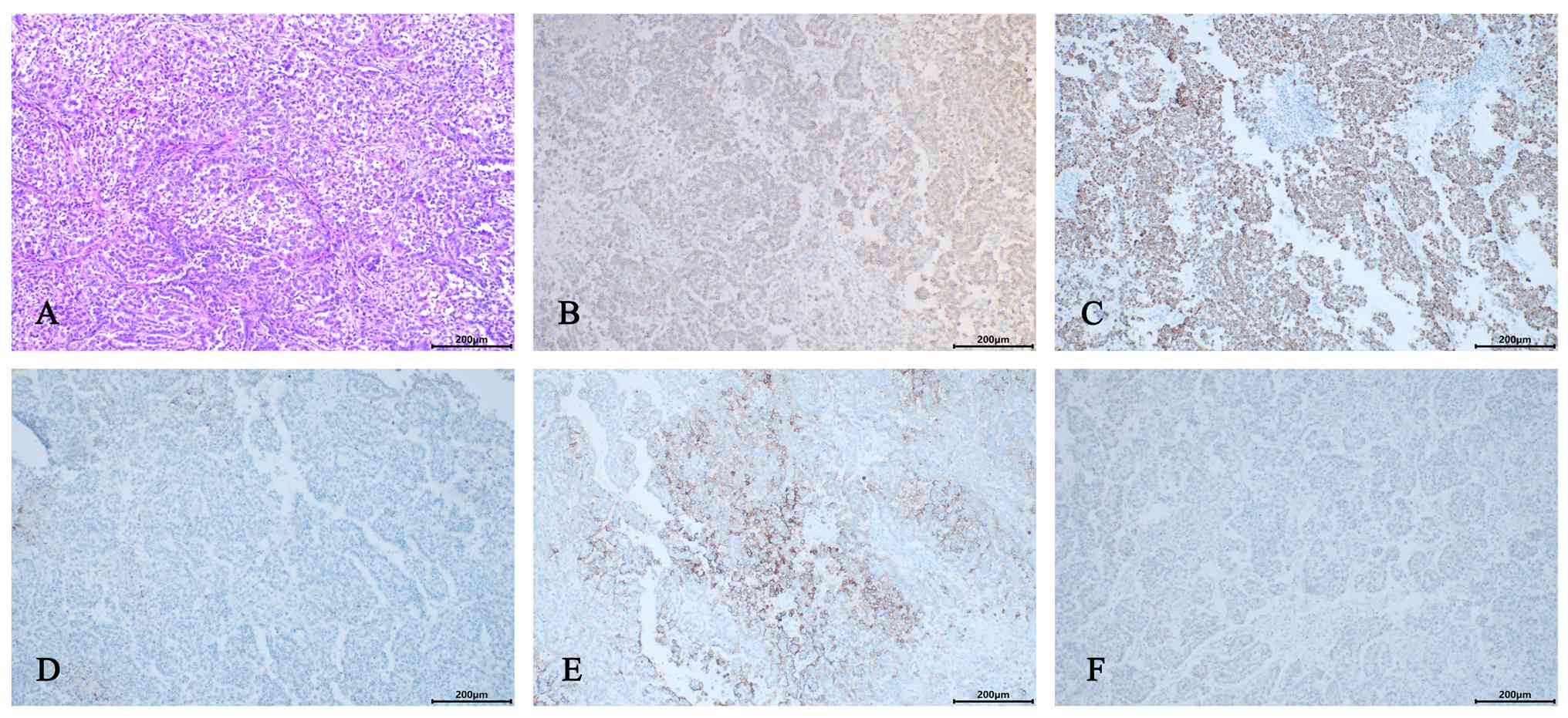 All specimens were fixed within 30 min post-resection in 4% neutral buffered formalin at room temperature for 24 h, followed by gross examination, routine dehydration, clearing and paraffin embedding. From each paraffin block, 4-µm thick sections were cut using a microtome for hematoxylin and eosin (H&E) staining. After deparaffinization in xylene and rehydration through a graded ethanol series, the sections were stained with hematoxylin at room temperature for 5 min, rinsed in running tap water, differentiated with 1% acid-alcohol, counterstained with eosin at room temperature for 3 min, dehydrated through ethanol, cleared in xylene and finally mounted with a resinous mounting medium. Histological examination was performed under an Olympus BX53 upright light microscope. H&E staining revealed that the tumor was composed of cells with cuboidal, polygonal or flattened morphology (Fig. 4A; scale bar, 200 µm; magnification, ×20). The cytoplasm was abundant and predominantly eosinophilic, but occasionally vacuolated. Nuclei were relatively regular, often featuring discernible nucleoli. Various morphological patterns were observed, including tubulopapillary, micropapillary, solid, clear cell, deciduoid, signet-ring cell-like, rhabdoid and pleomorphic variants.