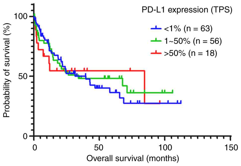 PD-L1 expression in lung adenocarcinoma tissue was assessed to evaluate the potential benefit of immunotherapy. The association between PD-L1 expression and OS was analyzed (Fig. 3). Immunohistochemistry using a 22C3 PD-L1 monoclonal antibody was performed in 137 patients. Of these patients, 63 had <1% PD-L1, 56 had 1–50% PD-L1 and 18 had >50% PD-L1 staining. The median OS times of these groups were 39.7, 34.1 and 84.5 months respectively; however, the differences among the groups were not statistically significant.