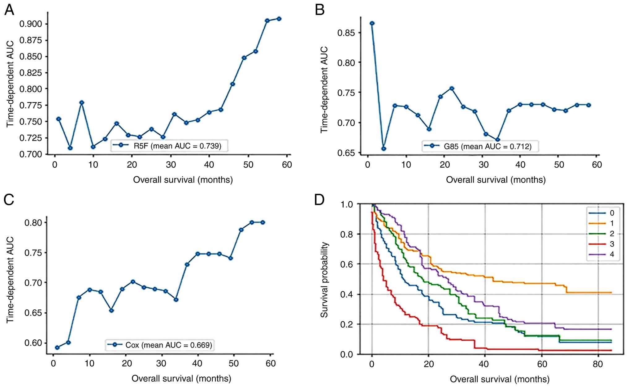 In survival prediction, patients with a higher estimated risk are expected to have shorter survival times. Model performance was evaluated using the C-index, which predicts the proportion of concordant patient pairs. Table IV summarizes the average C-index values for the different machine learning models. Among the evaluated models, the SVM achieved the highest C-index (~0.7018). Evaluation time points were defined at 3-month intervals from 1 to 60 months, providing a uniform temporal grid for performance assessment throughout the follow-up period. For each subject in the test set, the RSF, GBS and Cox proportional hazard models were trained separately to estimate individual cumulative hazard functions (Fig. 4A-C). The GBS model maintained a relatively stable AUC ranging from 0.65 to 0.75. By contrast, the AUC values of the RSF and Cox models gradually increased over 40 months, and reached their highest values at ~60 months. To further illustrate the individualized survival predictions generated by the RSF model, survival functions were estimated for a subset of test patients. Specifically, the first five subjects from the test set were selected, and their Kaplan-Meier survival curves are shown in Fig. 4D. The figure demonstrates distinct survival patterns among these subjects, with clear differences in survival probability over the entire follow-up period, highlighting heterogeneity in individual survival outcomes.