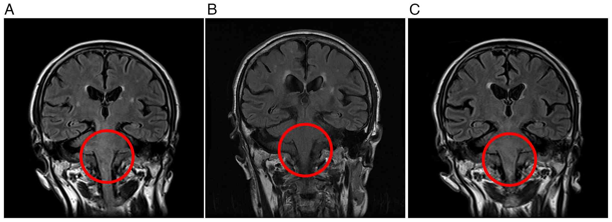 A 68-year-old man first presented in February 2023 to Tokyo Metropolitan Bokutoh Hospital (Tokyo, Japan) with weakness in the right leg and diplopia in the right eye. The diagnosis of primary central nervous system lymphoma (PCNSL) was established based on cerebrospinal fluid (CSF) cytology, immunocytochemical analysis and flow cytometric immunophenotyping, in conjunction with characteristic radiological findings. CSF cytology revealed clusters of atypical large lymphoid cells with irregular nuclei and prominent nucleoli. Immunocytochemical staining demonstrated strong membranous CD20 expression in the majority of atypical cells, and Ki-67 staining showed a high proliferative index. Flow cytometry confirmed a dominant B-cell population expressing CD19 and CD20. Given the typical MRI findings (Fig. 1A) and the clinical context, a diagnosis of PCNSL was made. A stereotactic brain biopsy was not performed due to the deep midbrain location of the lesion and the associated procedural risk. After diagnosis, the patient received intrathecal chemotherapy consisting of 40 mg/body prednisolone, 15 mg/body methotrexate and 40 mg/body cytarabine per administration. In parallel, the patient underwent methotrexate-based systemic chemotherapy combined with rituximab for four cycles. Rituximab was administered at 375 mg/m2 on day 1 of each 21-day cycle, and high-dose methotrexate was administered at 3,500 mg/m2 on day 3. Brain magnetic resonance imaging (Fig. 1B) demonstrated disappearance of the intracranial lesions, and the patient was judged to have achieved a complete response (CR). However, 3 months later, the patient relapsed and was treated again with four cycles of intrathecal MTX, cytarabine and steroids using the same dosing as previously applied. This was followed by whole-brain radiotherapy delivered at a total dose of 36 Gy in 20 fractions, which resulted in another CR. At 1-month post-CR, the patient presented with facial paralysis (inability to close the right eye), dysphagia and gait instability. Brain magnetic resonance imaging (MRI) confirmed a second relapse (Fig. 1C). Intrathecal MTX, cytarabine and steroids were reintroduced at the same dosage as previously applied, and tirabrutinib was initiated. Tirabrutinib was administered at a dose of 480 mg once daily on an empty stomach, which is the approved dose in Japan for the treatment of relapsed/refractory PCNSL. Owing to severe dysphagia caused by facial paralysis, a nasogastric tube was inserted and tirabrutinib was administered as a suspension through this once daily. Following a protocol similar to that reported by Yoshioka et al (9), six tablets of tirabrutinib (80 mg) were placed in a container, 20 ml of warm water at 55°C was added and the mixture was left for 10 min to dissolve. After confirming complete dissolution of the tirabrutinib tablets in the container, the resulting suspension was drawn into a syringe and administered via the nasogastric tube. To ensure complete administration of the suspension and prevent tube obstruction, the nasogastric tube was flushed with 20 ml of water after administering the suspension. Upon admission in November 2023, the patient received nutritional support via a nasogastric tube, and the facial paralysis gradually improved. Notably, the patient's dysphagia showed marked clinical improvement within 10 days of tirabrutinib initiation, allowing the patient to transition to an oral suspension (480 mg once daily) by day 11. By day 22, the patient was able to swallow food and tirabrutinib tablets. The patient was discharged on day 23, and oral tablets (480 mg once daily) were continued thereafter. No adverse events were observed during the suspension administration period.