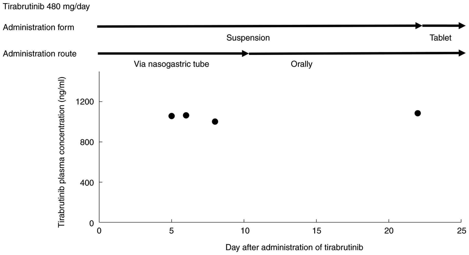 Tirabrutinib, an orally selective and irreversible Bruton's tyrosine kinase (BTK) inhibitor, covalently binds to BTK (1). Primary central nervous system lymphomas (PCNSLs) are rare and aggressive extranodal lymphomas, with a rising incidence particularly in the elderly population (2). While the majority of lymphoma cases are diffuse large B-cell lymphomas, PCNSL exhibits significant clinicopathological and radiological diversity, and the diagnosis remains challenging, often requiring invasive biopsies (3). Furthermore, the non-germinal center B-cell immunohistochemical subtype is more common in PCNSL than the germinal center B-cell subtype, and is associated with unfavorable prognostic factors, such as advanced age (>60 years), a high Ki-67 labeling index and a shorter overall survival time (4). PCNSLs are commonly treated with high-dose methotrexate (MTX)-based regimens or induction therapy comprising whole-brain radiation therapy, followed by high-dose systemic chemotherapy (5). Although highly responsive to first-line chemotherapy and radiotherapy, ~50% of patients with PCNSL experience relapse or refractory disease within 1 year (6). Tirabrutinib, a second-generation BTK inhibitor, was first approved in Japan for the treatment of relapsed or refractory PCNSL. Tirabrutinib targets key signaling pathways, such as the nuclear factor-κB pathway, which are critical for tumor cell survival (7). Patients with PCNSL often present with neurological deficits, and the clinical impact of dysphagia is particularly important in this population. Tablets with a total dimension >21 mm (length, width and thickness combined) have been reported to affect adherence in patients with swallowing disorders (8). The tirabrutinib tablet has a combined dimension of 21.5 mm. Therefore, administering tirabrutinib in patients with PCNSL can be difficult in cases where oral administration is not feasible. If tirabrutinib therapy is critical, administration of tirabrutinib as a suspension may be necessary. However, the manufacturer does not provide pharmacokinetic or safety data for tirabrutinib administered as a suspension or in crushed form. Two previous reports have described the administration of tirabrutinib suspension via a nasogastric tube in patients with PCNSL (9,10), but none have reported plasma concentrations. In the present case report, the safety, efficacy and plasma concentration of tirabrutinib administered as a suspension is evaluated in a patient with an inability to swallow tablets. Additionally, the relevant literature on the suspension administration of other tyrosine kinase inhibitors (TKIs), similar to that described in the present case, is reviewed.
