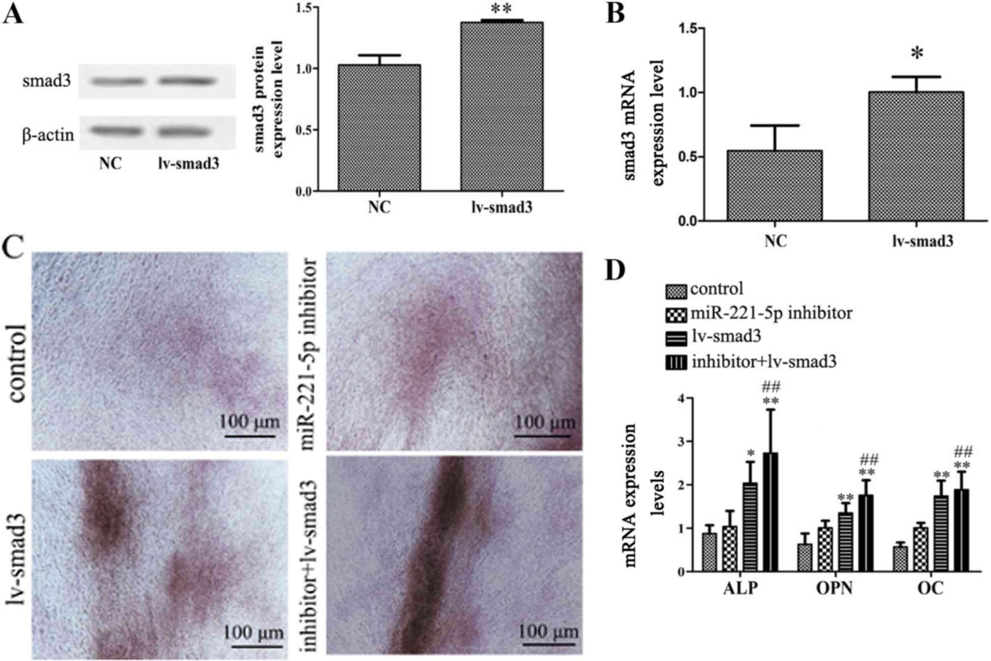 Following the publication of the above article, an interested reader drew to the authors’ attention that, for the osteogenic differentiation experiments shown in Fig. 4C on p. 6542, the ‘inhibitor+lv-smad3’ and ‘miR-221-5p inhibitor’ data panels appeared to contain an overlapping section of data, such that these data panels were apparently derived from the same original source where the results of different experiments were intended to have been portrayed.