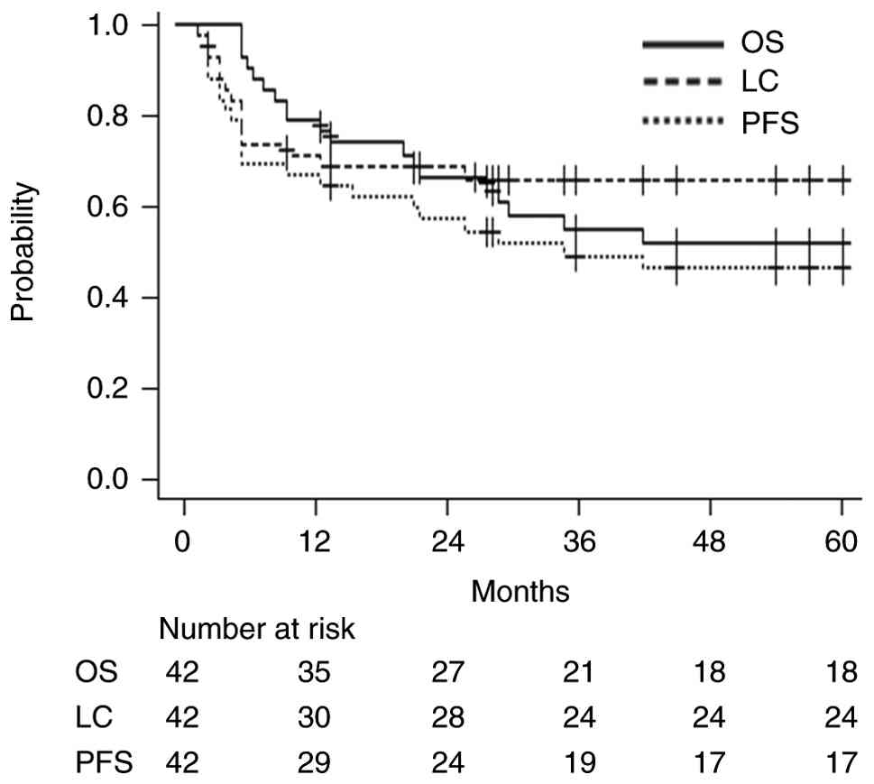 The median follow-up period of the 42 patients was 31.5 months (range: 6–120 months). Of the included patients, 14 died of the primary disease and 5 died of other causes. These five deaths from other causes consisted of one patient in the postoperative RT group (due to pneumonia) and four patients in the definitive RT group (due to pneumonia, heart failure, and other comorbidities). Recurrence was reported in 16 patients, including 14 with local recurrence, 5 with cervical lymph node recurrence, and 5 with distant organ metastases. Four of the seven patients (57%) who underwent the TPF regimen achieved local control without recurrence. The median interval from local recurrence to death was 4 months (range: 1–68 months). In all patients, the 3-year OS, PFS, and LC rates were 54.8% (95% confidence interval [CI]: 41.2–73.0%), 49.0% (95% CI: 37.7–69.1%), and 65.5% (95% CI: 54.1–83.7%), respectively, and the median survival duration was 42 months. Fig. 1 presents the OS, LC, and PFS curves for all 42 patients. Table II summarizes the prognostic factors on univariate analyses for OS, LC, and PFS. Univariate analyses revealed that the treatment method was a significant prognostic factor (surgery followed by RT vs. definitive RT: OS: hazard ratio [HR]: 9.60, 95% CI: 1.27–72.5, P=0.028; LC: HR: 12.22, 95% CI: 1.62–156.4, P=0.008; PFS: HR: 11.54, 95% CI: 1.54–86.5, P=0.017).