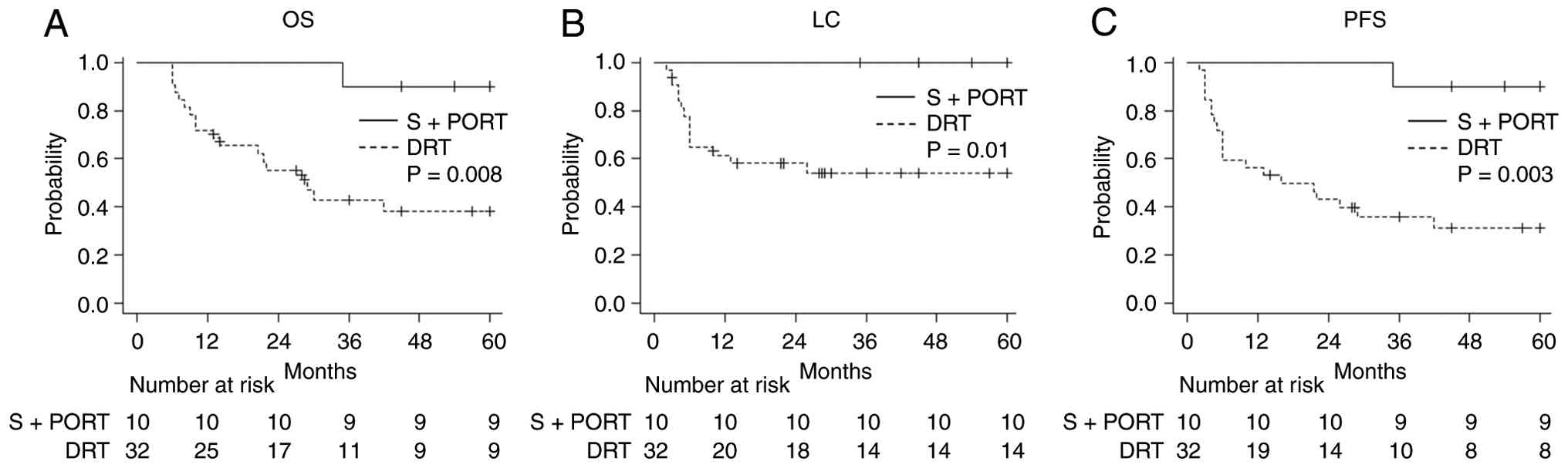 Overall, 2 patients in T2 stage and 8 in T3/T4 stage underwent surgery followed by RT. None of them had lymph node metastases, whereas 5 (50%) patients underwent concurrent systemic chemotherapy. In contrast, 9 patients in T1/T2 stage and 23 in T3/T4 were included in the definitive RT group. Of these, 3 had lymph node metastases and 29 patients did not. Moreover, 23 (72%) patients underwent concurrent systemic chemotherapy in definitive RT. The patient and treatment characteristics of the postoperative and definitive RT groups are summarized in Table III. Compared with the definitive RT group, the postoperative RT group had a significantly smaller PTV and received a lower RT dose (median PTV: 71 cm3 vs. 87 cm3, P=0.021; median RT dose: 60 Gy vs. 66 Gy, P=0.004). The 3-year OS, LC, and PFS rates in the postoperative and definitive RT groups were 90% vs. 42.9%, 100% vs. 53.9%, and 90% vs. 35.9%, respectively. P-values determined using the log-rank test were 0.008, 0.01, and 0.003, respectively. Fig. 2 presents the OS, LC, and PFS curves for both groups.