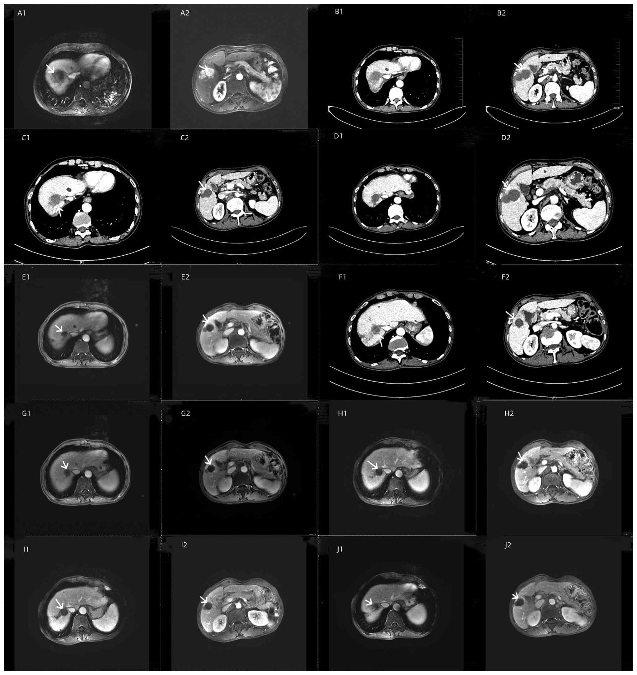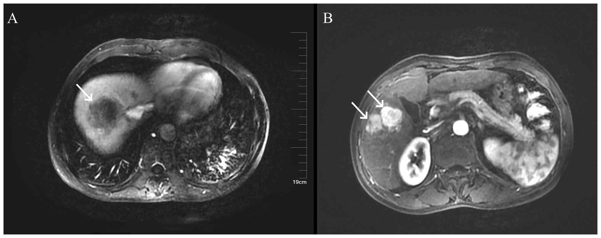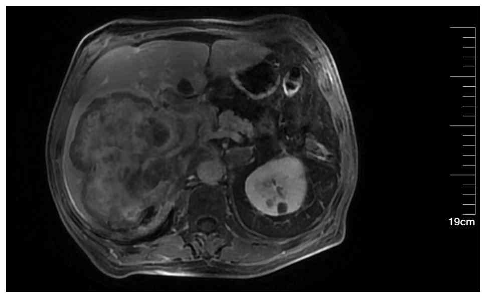 On June 14, 2022, the patient visited a local hospital where tumor markers were tested: AFP, 172.9 ng/ml (normal <7.0 ng/ml); CEA, 9.16 ng/ml (normal <5.0 ng/ml) and CA199, 53.08 U/ml (normal <37 U/ml). Biochemical tests showed ALT at 75.0 U/l (normal range 7–40 U/l) and hepatitis B virus DNA quantification at 5.35×105 IU/ml (indicating a high viral load). An enhanced CT scan of the upper abdomen revealed a low-density lesion in the right lobe of the liver measuring 7.98×6.65 cm, with possible liver cancer accompanied by intrahepatic, hilar and gastric lesser curvature metastases, along with potential peritoneal and retroperitoneal spread. The pancreatic head and body showed heterogeneous density, suggesting metastasis, and there were multiple small low-density lesions in the liver, possibly cysts, along with a small amount of pleural effusion on the right side and slight splenomegaly (data not shown). The patient had a history of hepatitis B for >10 years but had not been on regular entecavir treatment. Upon admission, physical examination revealed tenderness in the right upper abdomen and pain on percussion in the liver area. Laboratory tests showed coagulation function with prothrombin time at 14.5 sec (slightly prolonged; normal: 11.0–13.5 sec); fibrinogen level at 4.42 g/l (elevated; normal: 2.0–4.0 g/l); and biochemical tests indicated ALT at 55.5 U/l (elevated), AST at 81.3 U/l (elevated; normal <40 U/l), gamma-glutamyl transferase at 154.0 U/l (elevated; normal: 8–61 U/l), alkaline phosphatase at 107.4 U/l (normal range: 40–129 U/l), cholinesterase at 2,710 U/l (decreased; normal: 5,000-12,000 U/l) and hepatitis B surface antigen at 250.00 IU/ml (positive). An MRI of the liver and spleen, both plain and enhanced, showed a malignant lesion in segment (S)7-8 of the liver (49×46×36 mm) and a high likelihood of multiple intrahepatic metastatic tumors (S5: 27 mm) (Fig. 4). An ultrasound of the liver, gallbladder, pancreas and spleen indicated cirrhosis, multiple solid lesions in the liver, multiple abnormal lymph nodes at the hepatic hilum, stage 3 liver fibrosis and ascites. Endoscopy performed in late June 2022 revealed chronic non-atrophic gastritis (data not shown).