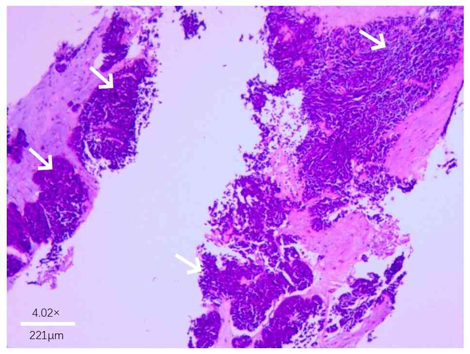 In conclusion, HSCNEC is a rare intrahepatic neuroendocrine tumor and its etiology remains unclear. Preoperative imaging diagnosis primarily relies on enhanced CT and MRI, while definitive diagnosis requires biopsy of the tumor for pathological assessment (11). Radical surgical resection is the preferred treatment option (9), and for patients who are not candidates for surgery, TACE combined with targeted immunotherapy can be considered (5). This multimodal approach can significantly enhance treatment efficacy, prolong overall survival, improve quality of life, reduce treatment-related adverse events, lower recurrence rates and ultimately improve prognosis (5,21). Additionally, regular follow-up is essential after comprehensive treatment (11).