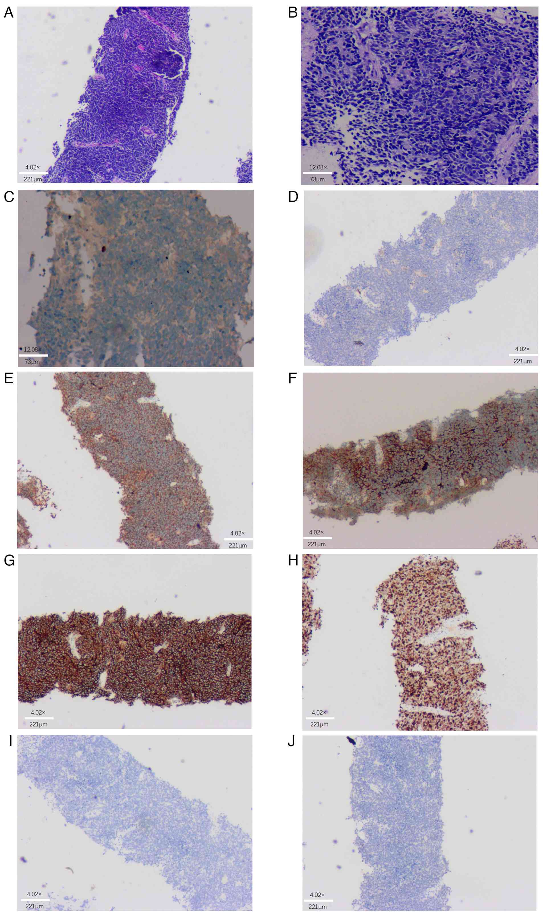 In Case 1, the immunohistochemical profile included chromogranin A (+), synaptophysin (+) and CD56 (+), all of which are established and highly specific markers for neuroendocrine differentiation. The positivity for these markers, along with the characteristic small cell morphology and high Ki-67 index (~70%), strongly supports the diagnosis of SCNEC. While analyses for pro-gastrin-releasing peptide, neuron-specific enolase and insulinoma-associated protein 1 were not routinely performed in this case, their absence does not undermine the diagnostic certainty, as the combination of chromogranin A, synaptophysin and CD56 is widely regarded as sufficient for diagnosing SCNEC in clinical and pathological practice (2). Furthermore, TTF-1 positivity (as reported) is also frequently associated with a small cell morphology and further supports the diagnosis (6).