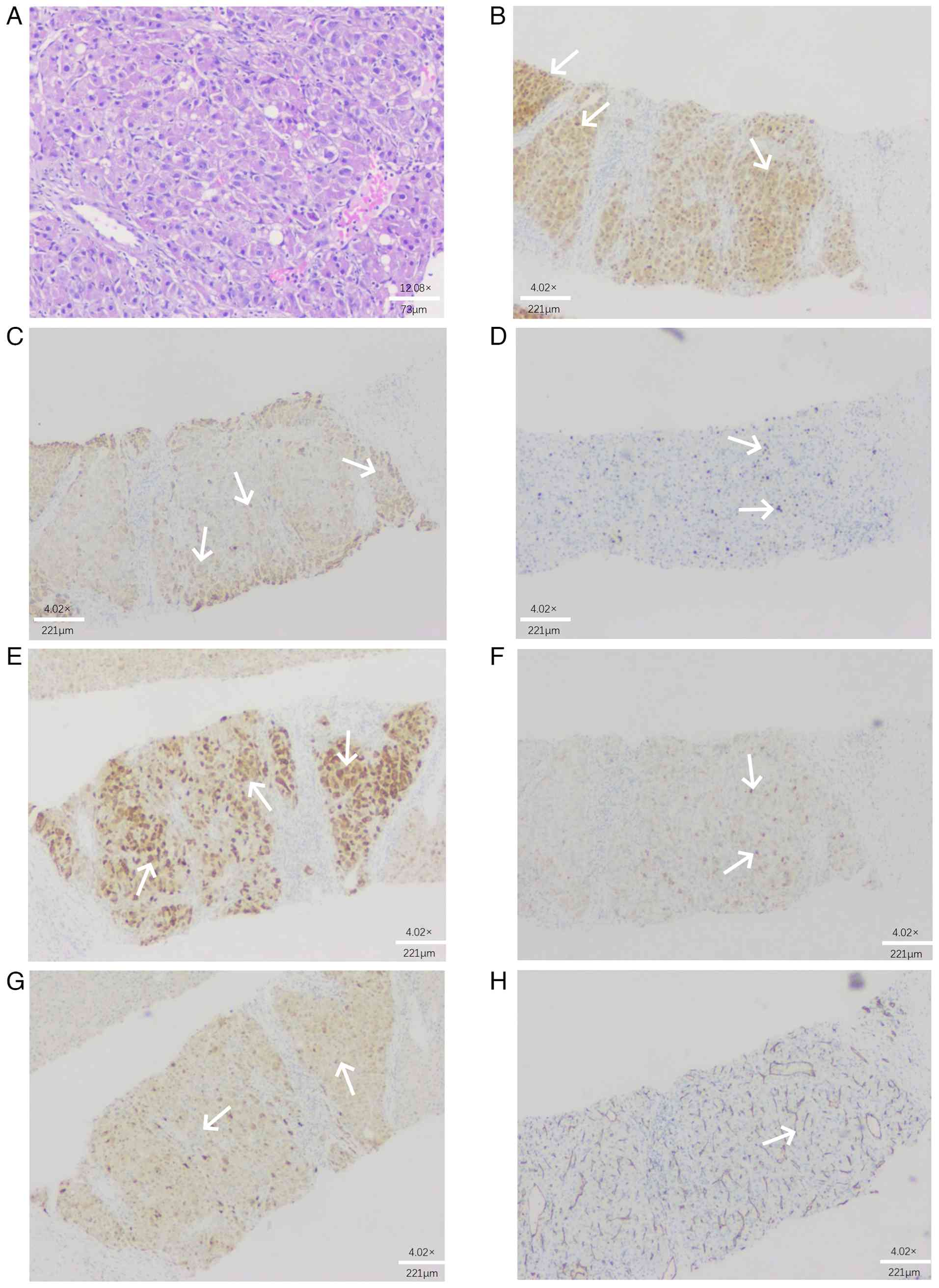 Immunohistochemical staining was performed on formalin-fixed, paraffin-embedded tissue sections using the EnVision FLEX+ detection system (cat. no. K8002; Dako; Agilent Technologies, Inc.) according to the manufacturer's instructions. The following primary antibodies were used: Pan-cytokeratin (CKpan; cat. no. ZM-0069), vimentin (cat. no. ZM-0260), CgA (cat. no. ZA-0507), Syn (cat. no. ZA-0569), cluster of differentiation 56 (CD56; cat. no. ZM-0427), TTF-1 (cat. no. ZM-0270), arginase-1 (cat. no. ZA-0641), HepPar-1 (cat. no. ZM-0133), P53 (cat. no. ZM-0408), Ki-67 (cat. no. ZM-0166), CD34 (cat. no. ZM-0046), CK19 (cat. no. ZM-0074), alpha-fetoprotein (AFP; cat. no. ZM-0008), CK7 (cat. no. ZM-0071), CK20 (cat. no. ZM-0072), Villin (cat. no. ZM-0441), caudal type homeobox 2 (CDX2; cat. no. ZA-0520), MutL homolog 1 (MLH1; cat. no. ZA-0544), MutS homolog 2 (MSH2; cat. no. ZA-0542), MSH6 (cat. no. ZA-0546), postmeiotic segregation increased 2 (PMS2; cat. no. ZA-0548), glutamine synthetase (cat. no. ZA-0645), glypican-3 (cat. no. ZM-0446), heat shock protein 70 (HSP70; cat. no. ZA-0580; all ready-to-use; from OriGene Technologies, Inc.), and programmed cell death ligand 1 (PD-L1; cat. no. M3653; dilution 1:50; Dako; Agilent Technologies, Inc.).